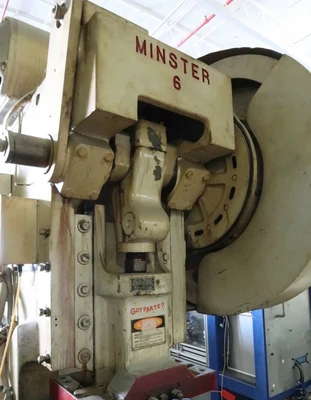 THE MINSTER MODEL 6 OPEN BACK INCLINABLE (O.B.I.) PRESS IS A ROBUST 60-TON CAPACITY MACHINE. KEY FEATURES INCLUDE AN AIR CLUTCH AND BRAKE SYSTEM, AND A REEVES VARIABLE-SPEED DRIVE, POWERED BY A 7.5 HP MOTOR IN A FLYWHEEL DESIGN. TECHNICAL SPECIFICATIONS DETAIL A 4-INCH STROKE LENGTH AND A 13-INCH SHUT HEIGHT TO THE BED (SDAU) WITH A 3-INCH RAM ADJUSTMENT. THE PRESS OFFERS VARIABLE SPEEDS RANGING FROM 90 TO 180 STROKES PER MINUTE (SPM). DIMENSIONAL CAPACITIES INCLUDE A RAM AREA OF 21" L-R X 14" F-B, A BED AREA OF 32" L-R X 21" F-B, AND A BOLSTER AREA MATCHING THE BED AREA WITH A 2.5" BOLSTER THICKNESS. THE BED OPENING MEASURES 18" L-R X 14" F-B, AND THE THROAT DEPTH IS 11". THE OVERALL HEIGHT OF THE MACHINE IS 114".