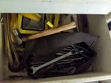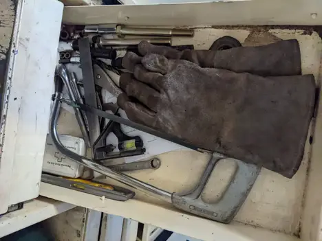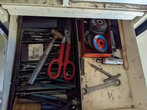 7 DRAWER TOOL CABINET LOCKER WITH CONTENTS, ASSORTED TOOLS, SOCKETS, SAWS, WRENCHES, HAMMERS