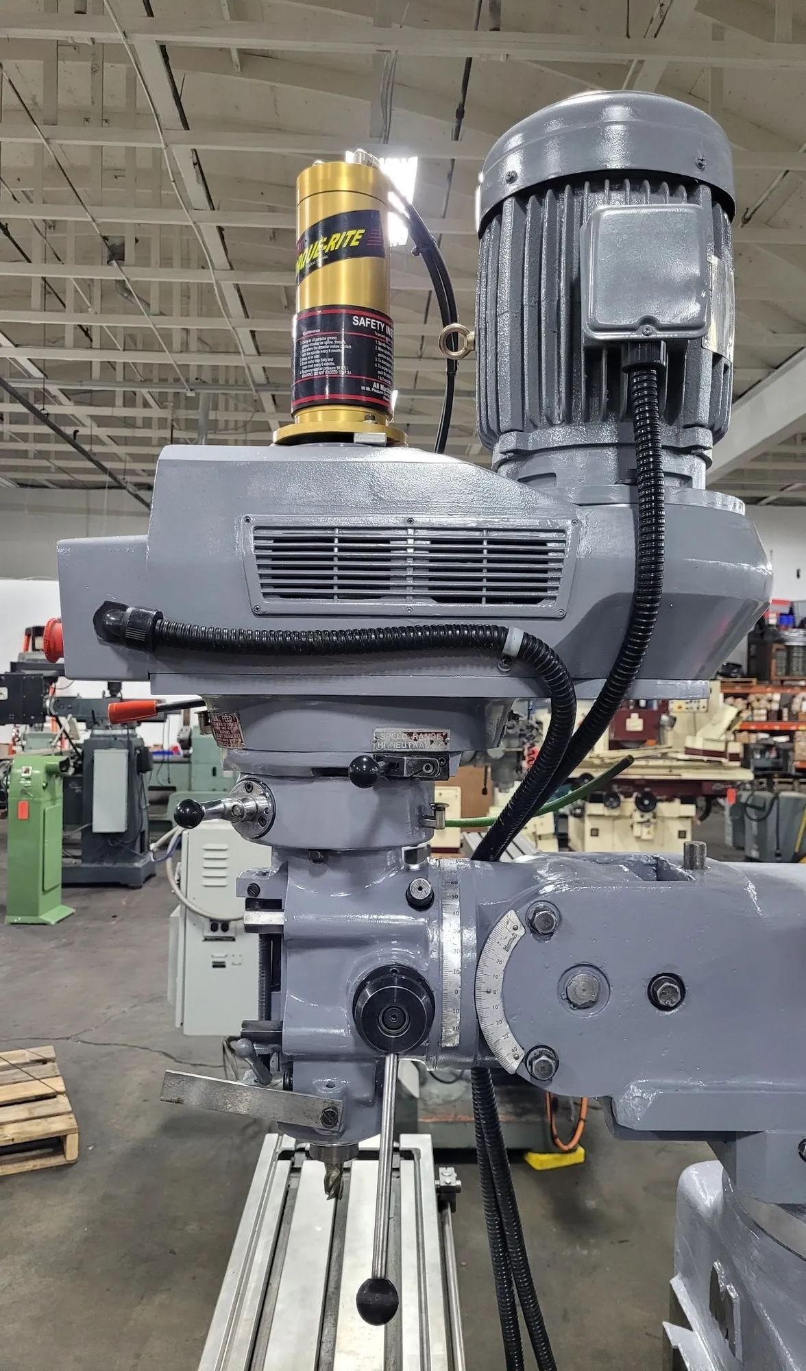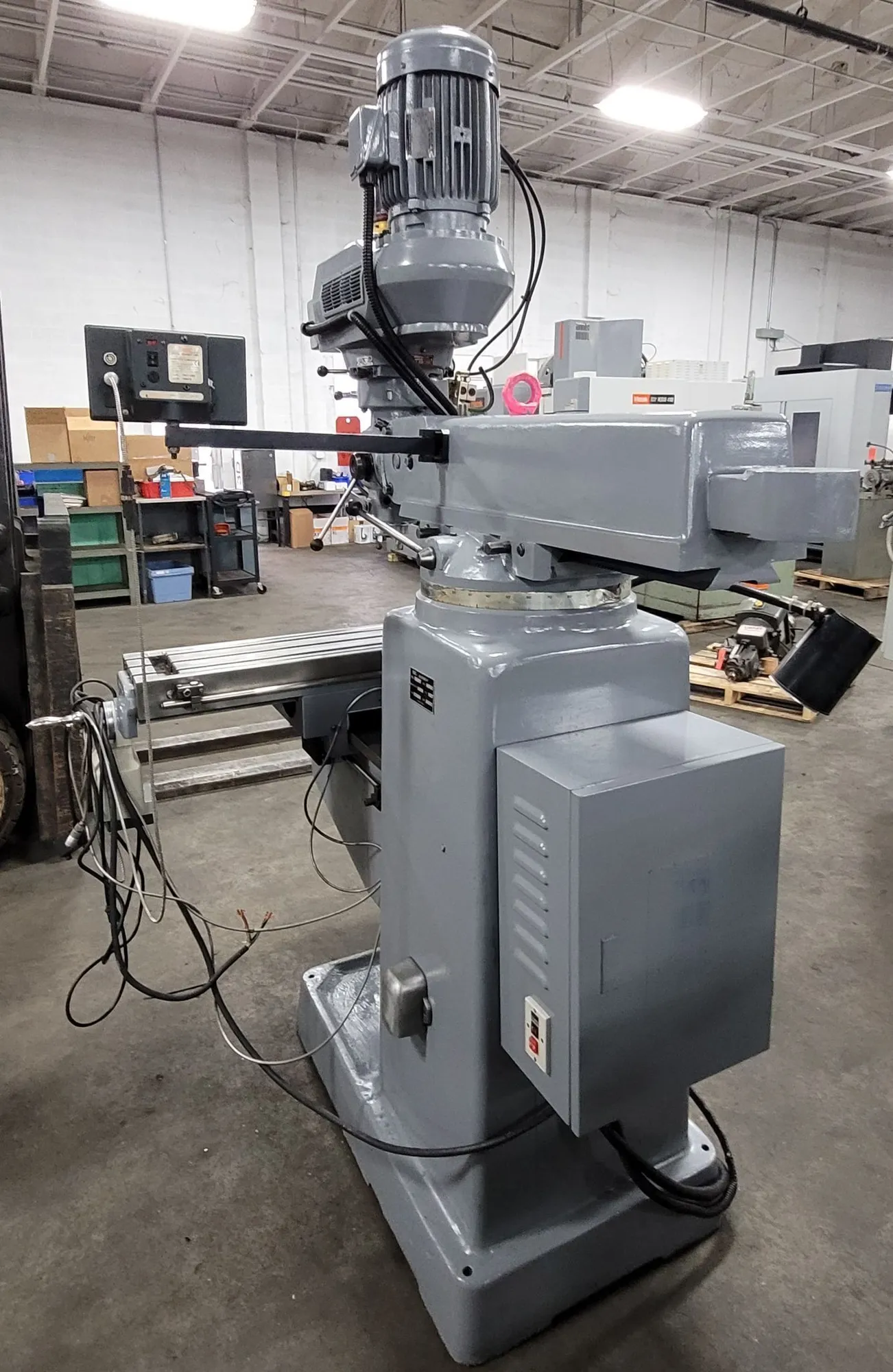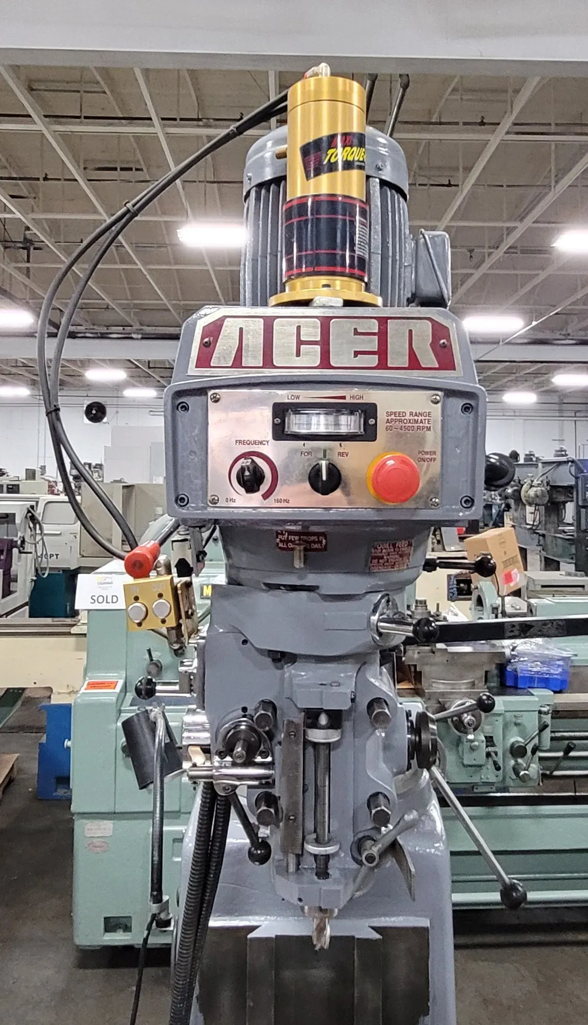 THE ACER 3CVS VERTICAL MILL IS EQUIPPED WITH A 3 HP MOTOR WIRED FOR 230V 3 PHASE OPERATION, FEATURING AN R8 SPINDLE TAPER AND A VARIABLE SPINDLE SPEED RANGE OF 60 TO 4,500 RPM. THE MACHINE UTILIZES A 9" X 42" TABLE AND INCLUDES AN X-AXIS POWER FEED AND A MAXI RITE POWER DRAWBAR. TRAVEL DIMENSIONS INCLUDE 28" FOR LONGITUDINAL MOVEMENT, 12" FOR CROSS MOVEMENT, 16" FOR VERTICAL KNEE TRAVEL, AND 12" FOR RAM TRAVEL. THE QUILL HAS A 3-3/8" DIAMETER AND 5" OF TRAVEL. HEAD ADJUSTMENTS ALLOW FOR 90 DEGREES LEFT-TO-RIGHT AND 45 DEGREES FRONT-TO-BACK TILT. INSTRUMENTATION INCLUDES A NEWALL TOPAZ DIGITAL READOUT FOR THE X AND Y AXES. THE TABLE IS FITTED WITH THREE 5/8" T-SLOTS.