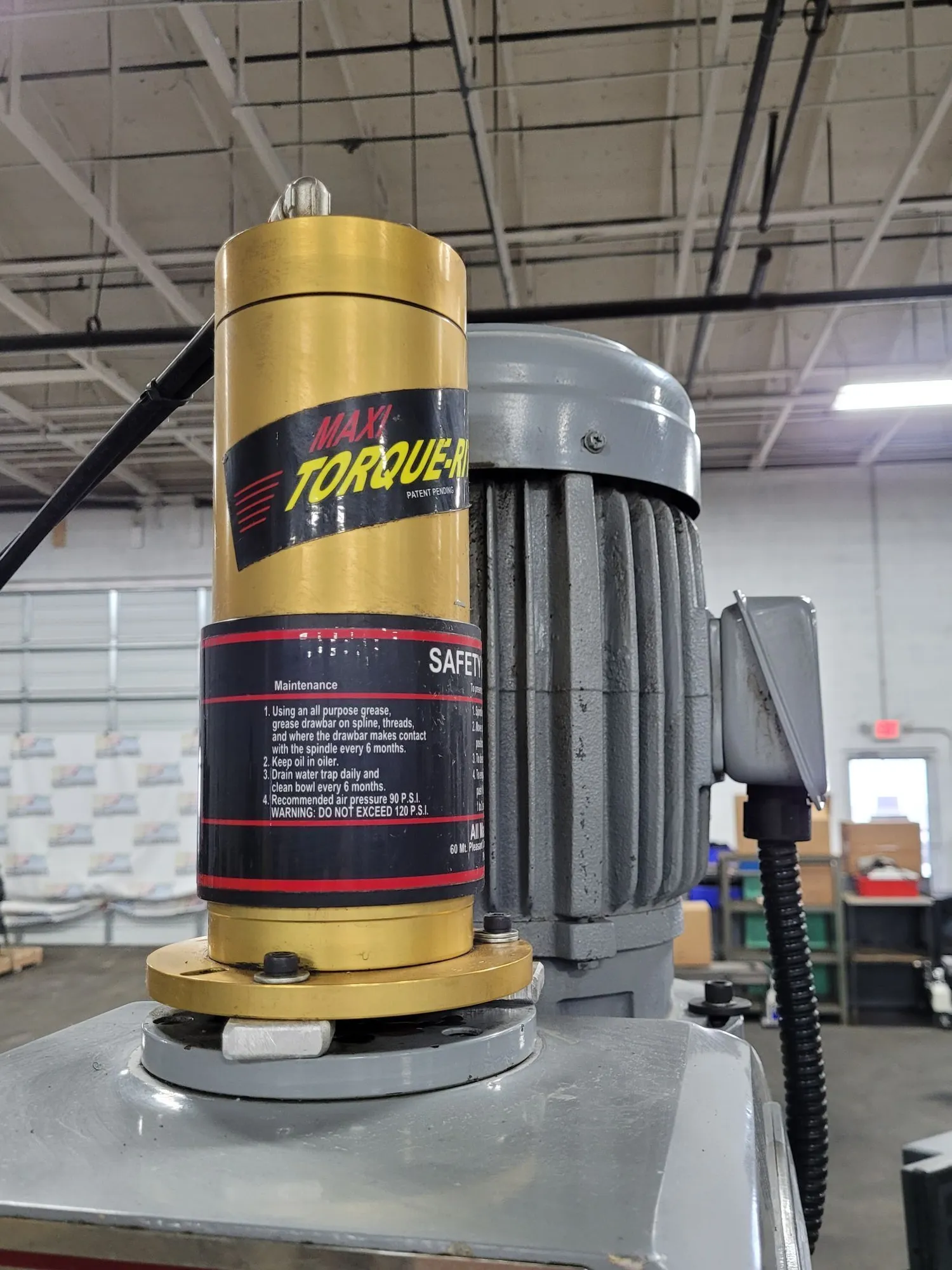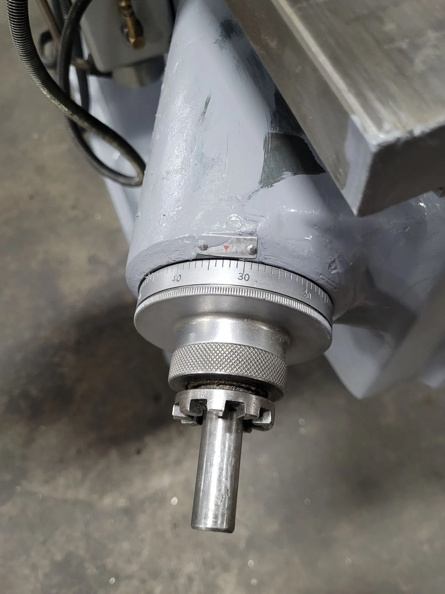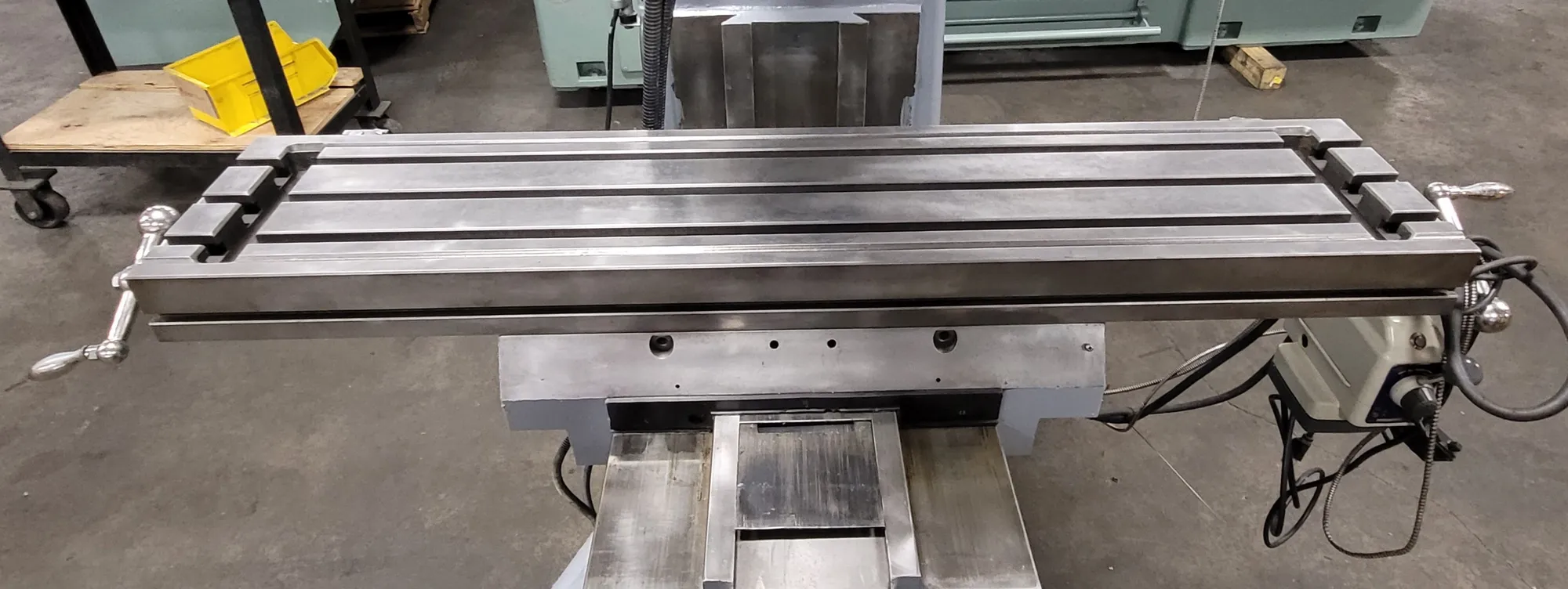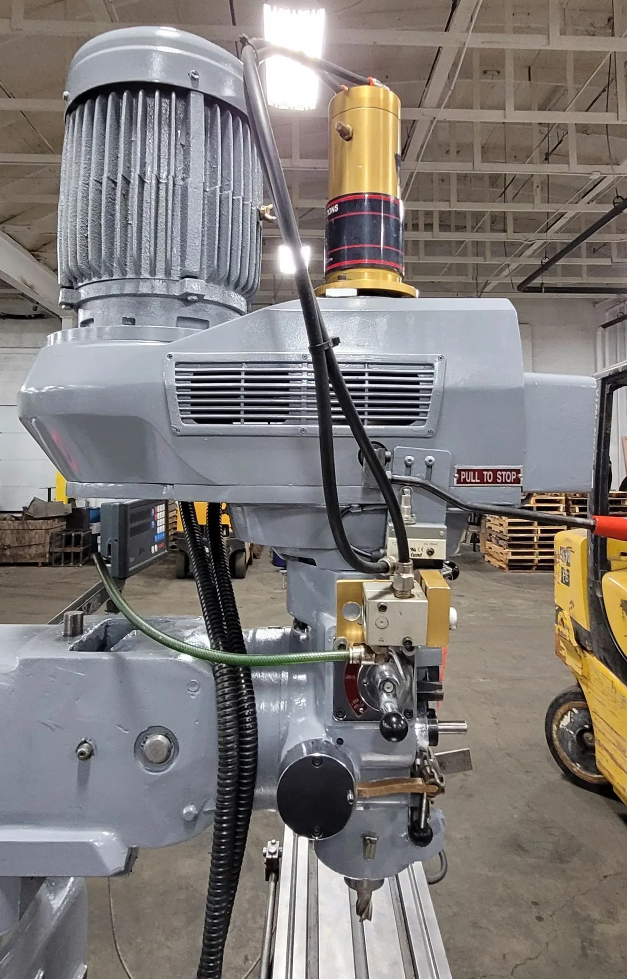 THE ACER 3CVS VERTICAL MILL IS EQUIPPED WITH A 3 HP MOTOR WIRED FOR 230V 3 PHASE OPERATION, FEATURING AN R8 SPINDLE TAPER AND A VARIABLE SPINDLE SPEED RANGE OF 60 TO 4,500 RPM. THE MACHINE UTILIZES A 9" X 42" TABLE AND INCLUDES AN X-AXIS POWER FEED AND A MAXI RITE POWER DRAWBAR. TRAVEL DIMENSIONS INCLUDE 28" FOR LONGITUDINAL MOVEMENT, 12" FOR CROSS MOVEMENT, 16" FOR VERTICAL KNEE TRAVEL, AND 12" FOR RAM TRAVEL. THE QUILL HAS A 3-3/8" DIAMETER AND 5" OF TRAVEL. HEAD ADJUSTMENTS ALLOW FOR 90 DEGREES LEFT-TO-RIGHT AND 45 DEGREES FRONT-TO-BACK TILT. INSTRUMENTATION INCLUDES A NEWALL TOPAZ DIGITAL READOUT FOR THE X AND Y AXES. THE TABLE IS FITTED WITH THREE 5/8" T-SLOTS.