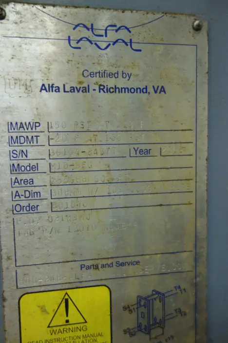 ALFA LAVAL M10 BFG PLATE HEAT EXCHANGER, GASKETED PLATE AND FRAME, 150 PSI AT 113 F, 255.66 SQ FT
