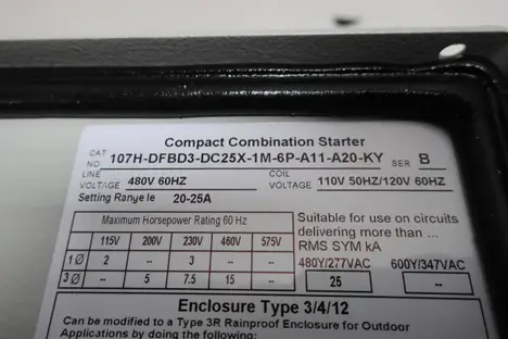 ALLEN BRADLEY 107H-DFBD3-DC25X-1M-6P REVERSING COMBINATION STARTER 120V-AC 15HP