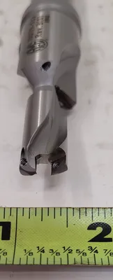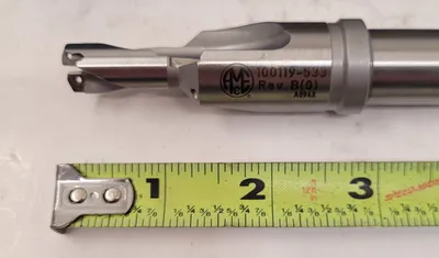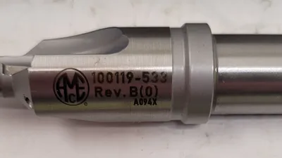 THIS ALLIED MACHINE SPECIAL HOLDER, MODEL 1001119-533, IS DESIGNED FOR USE WITH 13MM DRILL ENDS FEATURING 2 FLUTES AND A HELIX. THE TOOL HAS AN OVERALL LENGTH (OAL) OF 4.92 INCHES, A SHANK DIAMETER OF 3/4 INCHES, AND A SHANK LENGTH OF 2 INCHES. IT ALSO FEATURES A BORE IN THE SHANK MEASURING 0.42 INCHES.