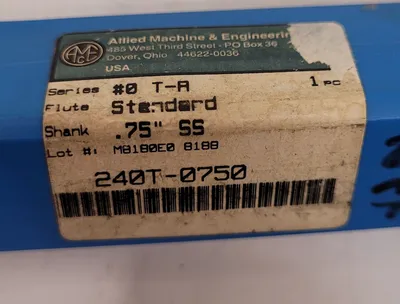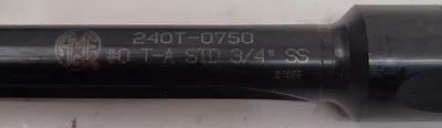 THE AMEC 240T-0750N EXCHANGEABLE TIP DRILL, MANUFACTURED BY ALLIED MACHINE & ENGINEERING, IS A .586” SPADE DRILL. IT FEATURES A STANDARD SHANK AND IS PART OF THE #0 T-A SERIES. THE TOOL HAS AN OVERALL LENGTH (OAL) OF 5.68” AND A SHANK LENGTH OF 2.4IN. IT INCLUDES TWO STRAIGHT FLUTES, EACH MEASURING 3” IN LENGTH. THE DRILL'S CUT END DIAMETER, WITHOUT THE INSERT, IS 1/2IN.