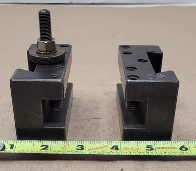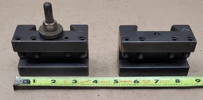 THIS IS AN ALORIS CXA 1 LATHE TOOL POST HOLDER SET, CONSISTING OF TWO HOLDERS. THE TOOL POST HOLDER UTILIZES A CXA 1 PART NUMBER AND IS DESIGNED FOR LATHES WITH A SWING OF 13 TO 18 INCHES. KEY DIMENSIONS INCLUDE AN OVERALL HEIGHT OF 2-1/8 INCHES AND AN OVERALL LENGTH OF 3-1/2 INCHES. THE TOOL HOLDER WEDGE MEASURES 2-1/4 INCHES. THE HOLDER HAS A CENTERLINE HEIGHT OF 1-7/16 INCHES AND ACCOMMODATES A MAXIMUM CUTTING TOOL SIZE OF 3/4 INCH, WITH A TOOL BIT RANGE OF 1/4 TO 3/4 INCH. THE HOLDER DOES NOT SUPPORT THROUGH COOLANT FUNCTIONALITY.