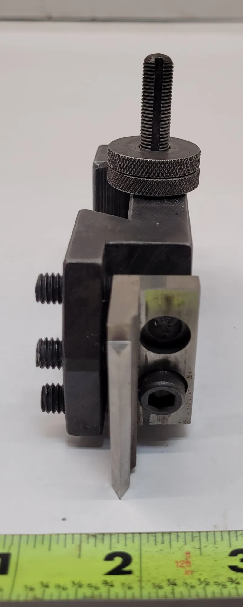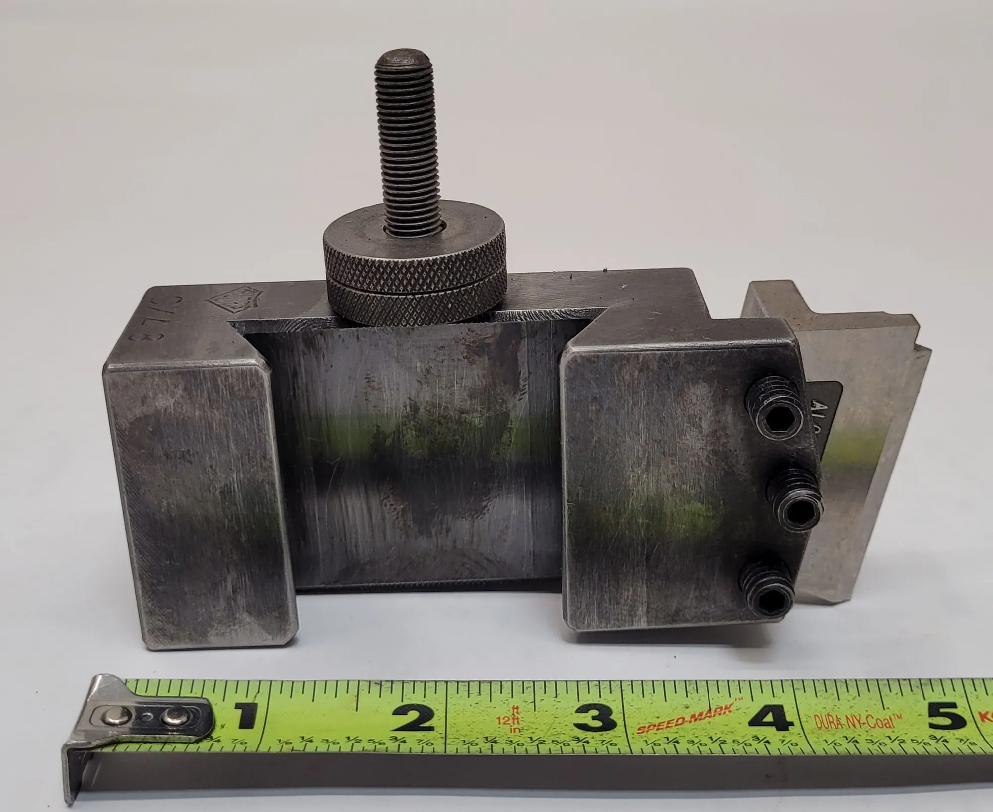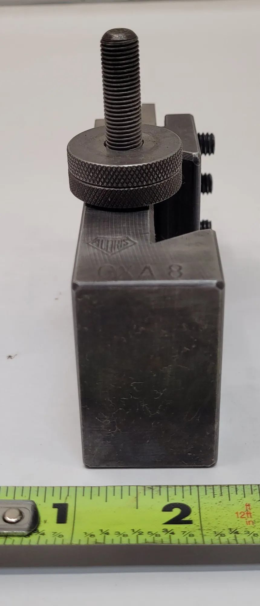THE ALORIS CXA-8 IS A THREADING TOOL HOLDER DESIGNED FOR LATHE OPERATIONS. THIS UNIT FEATURES A WEDGE SIZE OF 2-3/8 INCHES AND INCLUDES AN ALORIS P-6 CUTTER. THE PHYSICAL DIMENSIONS OF THE HOLDER WITH THE CUTTER INSTALLED ARE 5 INCHES IN WIDTH, 2 INCHES IN HEIGHT, AND 1-1/4 INCHES IN DEPTH.