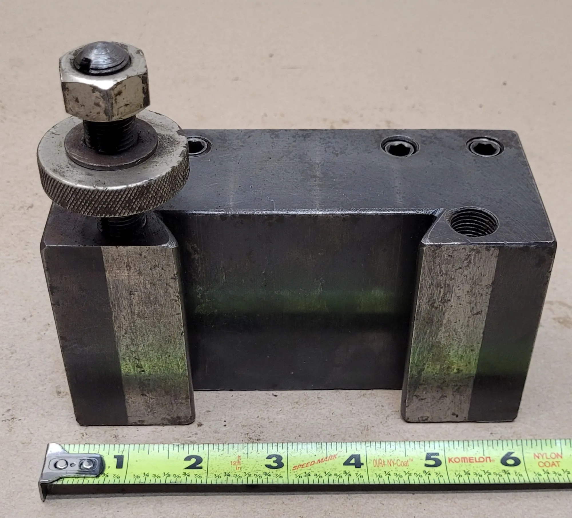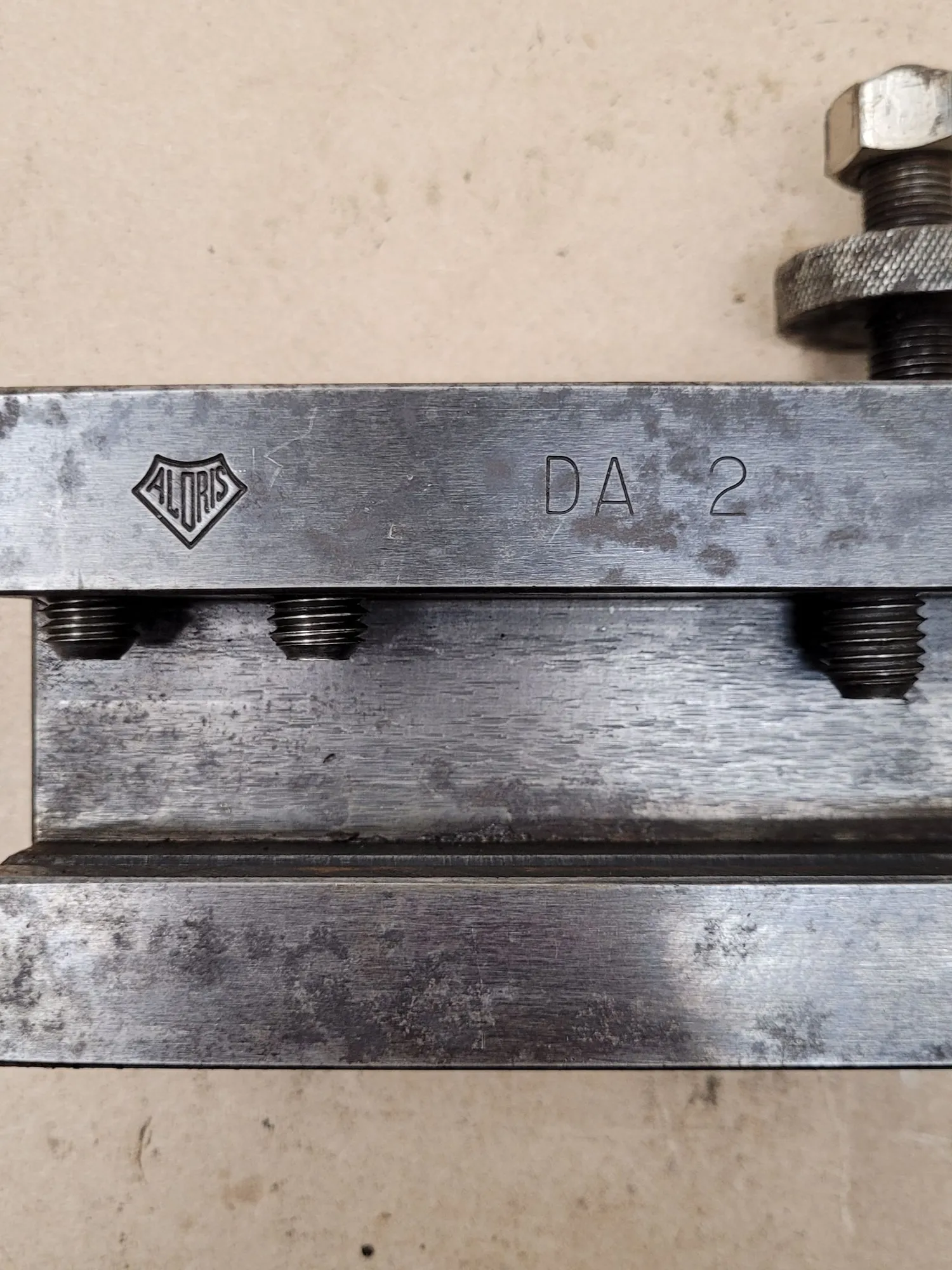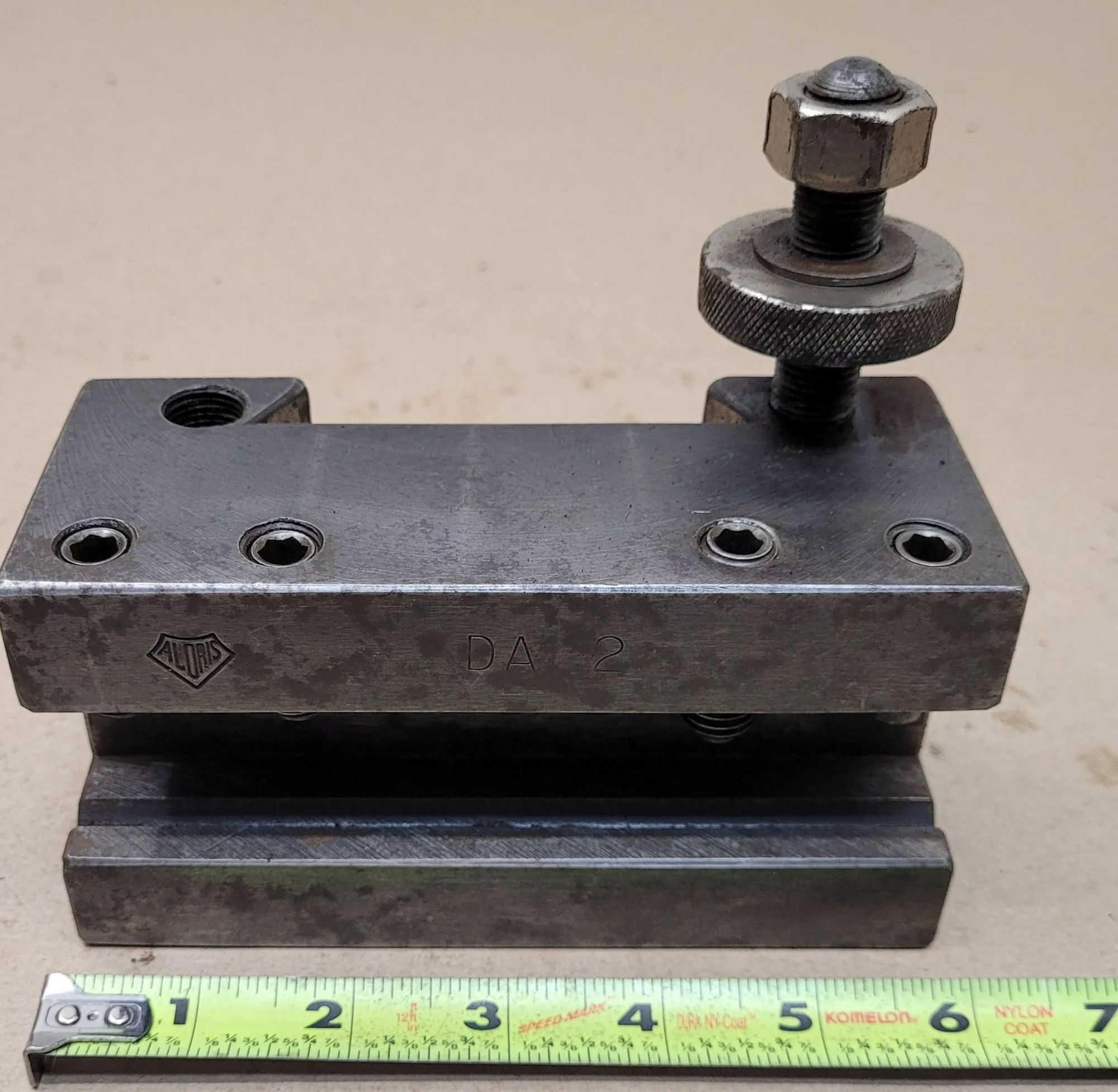 THE ALORIS QUICK-CHANGE DA-2 TOOL HOLDER IS A TURNING, FACING, AND BORING TOOL POST HOLDER DESIGNED FOR LATHES WITH A SWING RANGING FROM 17 TO 48 INCHES. THIS UNIT FEATURES A 1-INCH SHANK SIZE AND A MAXIMUM CUTTING TOOL CAPACITY OF 1-1/4 INCHES. TECHNICAL SPECIFICATIONS INCLUDE AN OVERALL HEIGHT OF 3-1/8 INCHES, AN OVERALL LENGTH OF 5-7/8 INCHES, AND A HOLDER DEPTH OF 1.0000 INCH. THE BORING BAR SIZE IS 3-1/8 INCHES, WITH A CENTERLINE HEIGHT OF 2-3/16 INCHES AND A TOOL BIT RANGE OF 3/4 TO 1-1/4 INCHES. THIS HOLDER DOES NOT SUPPORT THROUGH-COOLANT APPLICATIONS.