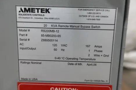 AMETEK RS 200MB-12 REMOTE MANUAL BYPASS SWITCH, 20 KVA, 60 HZ, 1 PH, 167 AMP