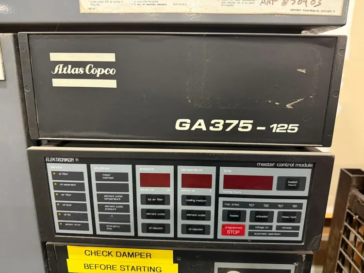 ATLAS COPCO GA375-125 ROTARY SCREW COMPRESSOR 100HP 460V 60HZ 3PH 108 PSI 210 L/S 1500 R/MIN