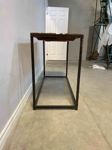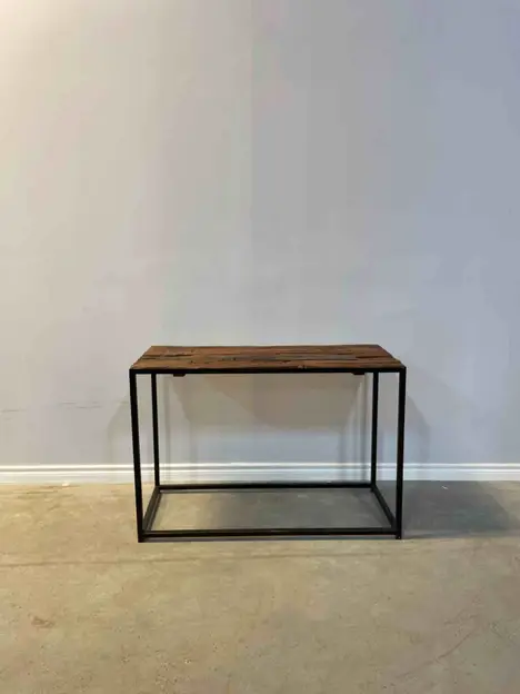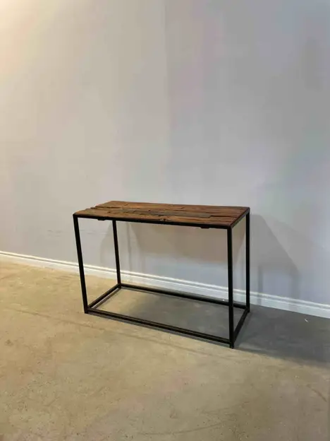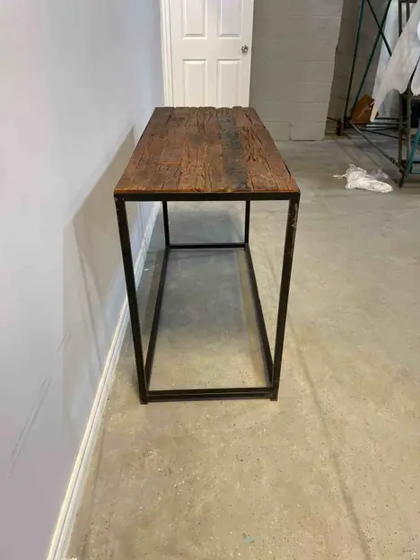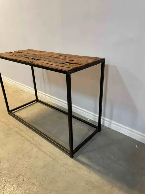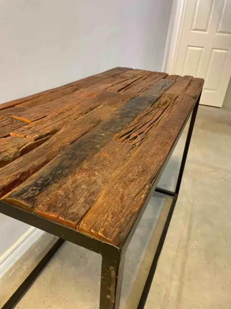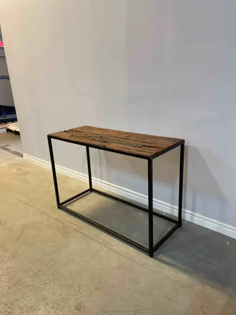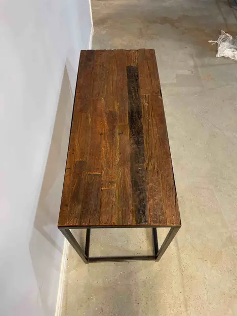 BARK WOOD CONSOLE TABLE 48" X 20" X 32". DISTRESSED BARK WOOD TOP