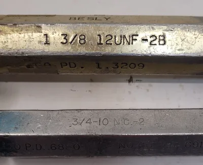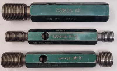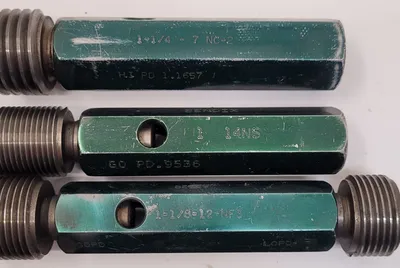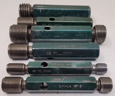 THIS ITEM IS A BESLY GO/NO GO PLUG GAUGE SET, CONSISTING OF EIGHT INDIVIDUAL GAUGES. THE SET INCLUDES A RANGE OF SIZES FOR THREAD ACCURACY CHECKS. THE SIZES INCLUDED ARE 1-14 NS, 1-1/4-7 NC2, 7/8-14 NF, 1-1/8-12 NF3, 3/4-16 NF3, 9/16-18 NF3, 3/4-10 NC10, AND 1-3/8-12 UNF-2B.