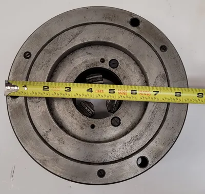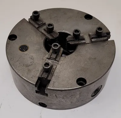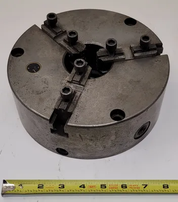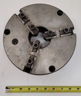 THIS BISON 3 JAW CHUCK IS AN ADJUSTABLE LATHE CHUCK WITH AN 8-INCH OVERALL DIAMETER. IT IS DESIGNED WITH 3 JAWS. TECHNICAL SPECIFICATIONS INCLUDE A CENTER HOLE ID OF 2-1/2 INCHES AND A CENTER HOLD OD OF 4-5/8 INCHES.