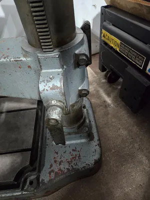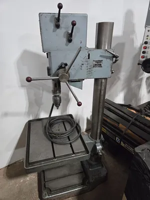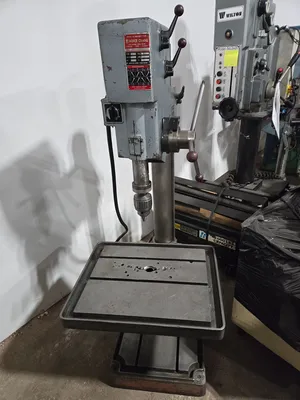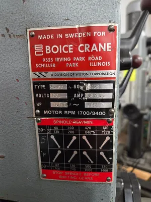 THE BOICE CRANE 24200 GEARED HEAD DRILL PRESS IS A SINGLE-SPINDLE MACHINE FEATURING A 12-INCH THROAT DEPTH. THE DRILL PRESS IS EQUIPPED WITH AN 8-SPEED GEARED HEAD, OFFERING SPINDLE SPEEDS RANGING FROM 82 TO 1,460 RPM. IT HAS A 6-INCH HAND-FEED QUILL AND UTILIZES A #3MT SPINDLE TAPER. THE ADJUSTABLE HEIGHT TABLE MEASURES 21 INCHES BY 17 INCHES. POWER IS SUPPLIED BY A 2-SPEED SPINDLE DRIVE MOTOR RATED AT 1.3/1.6 HP, OPERATING ON 220V 3 PHASE ELECTRICITY.