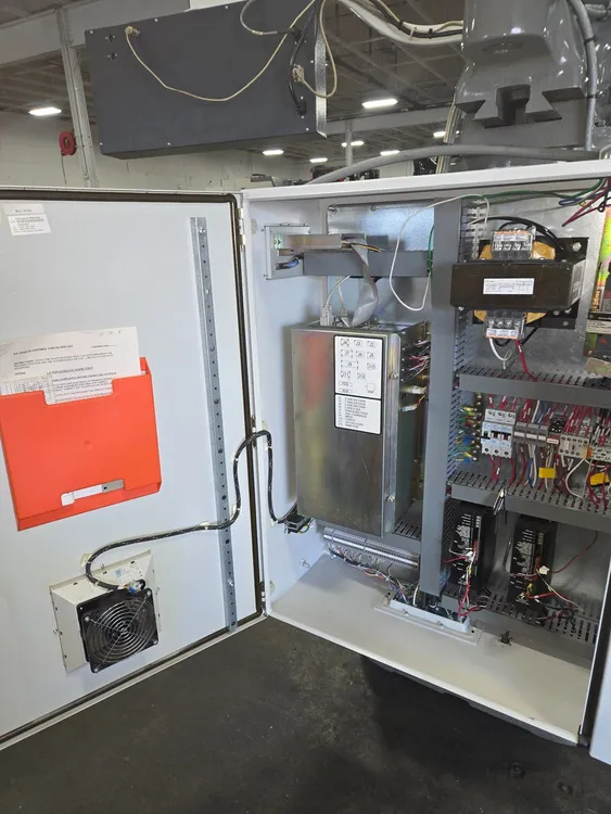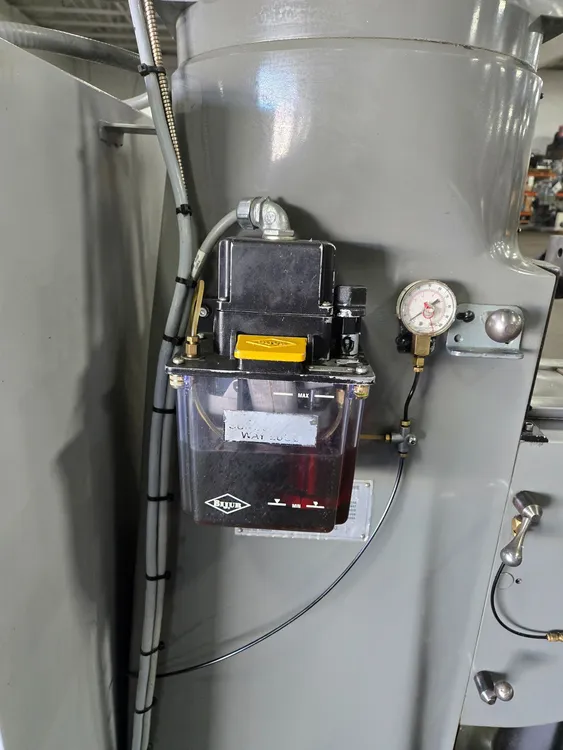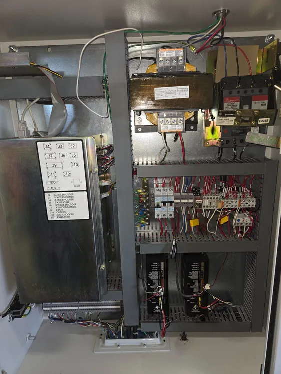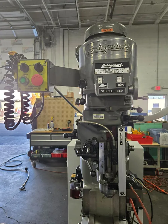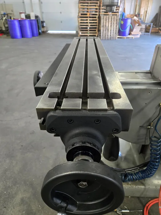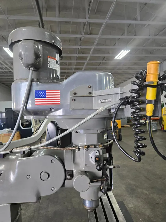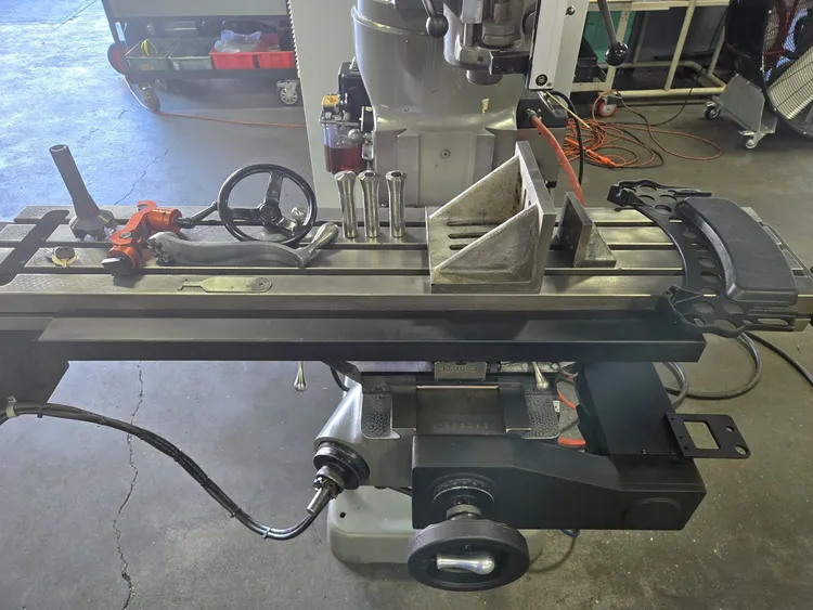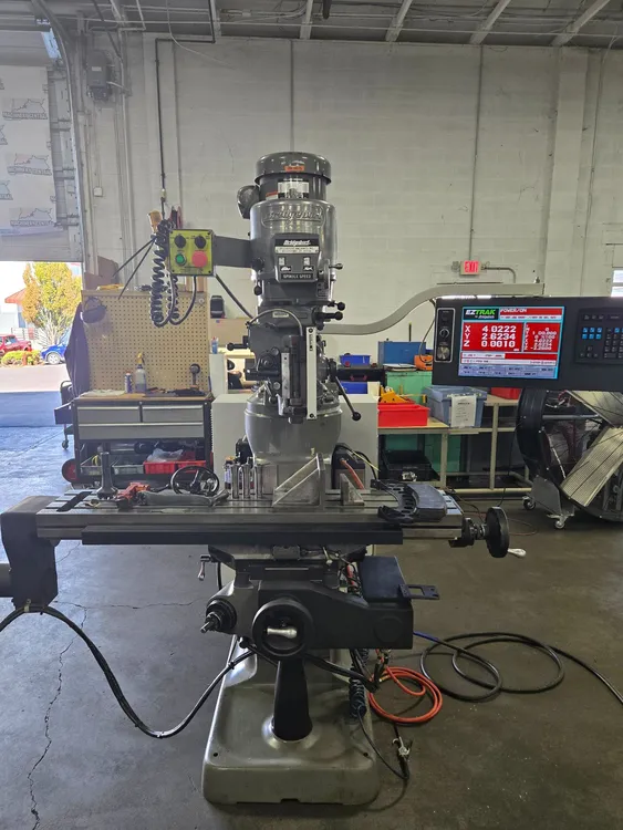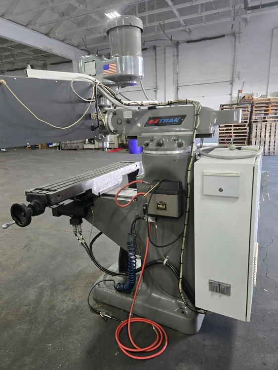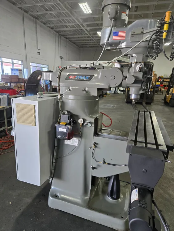 THE BRIDGEPORT SERIES 1 EZ TRAK DX IS A CNC VERTICAL MILL EQUIPPED WITH A 9" X 48" TABLE AND A 2 HP VARIABLE SPEED HEAD FEATURING AN R8 TAPER SPINDLE. KEY MACHINE TRAVELS INCLUDE A 33.5" LONGITUDINAL (X) TRAVEL, 12" CROSS (Y) TRAVEL, 14" VERTICAL KNEE TRAVEL, 12" RAM TRAVEL, AND 5" QUILL TRAVEL. THE SPINDLE OFFERS INFINITELY VARIABLE SPEEDS FROM 60 TO 4200 RPM, WITH QUILL FEED RATES OF 0.0015", 0.003", AND 0.006". THE X AND Y AXES HAVE A POSITIONING SPEED OF 100 INCHES PER MINUTE AND A FEED RATE RANGE OF 0.1 TO 100 INCHES PER MINUTE. THE THROAT DISTANCE RANGES FROM 6-3/4" TO 18-3/4", AND THE TABLE TO SPINDLE NOSE DISTANCE IS 2-1/2" TO 18-1/4". THE MACHINE IS POWERED BY A 2 HP MOTOR AND IS CURRENTLY WIRED FOR 230V 3 PHASE, 60 CYCLES, WITH FULL LOAD AMPS OF 6.2. IT FEATURES CHROME WAYS, A TRICO MIST COOLANT SYSTEM, A BUJIR AUTO LUBE SYSTEM, ANGLE BLOCKS, AND R8 COLLETS. APPROXIMATE DIMENSIONS ARE 70" X 77" X 87" HIGH, WITH AN APPROXIMATE WEIGHT OF 3,000 LBS.