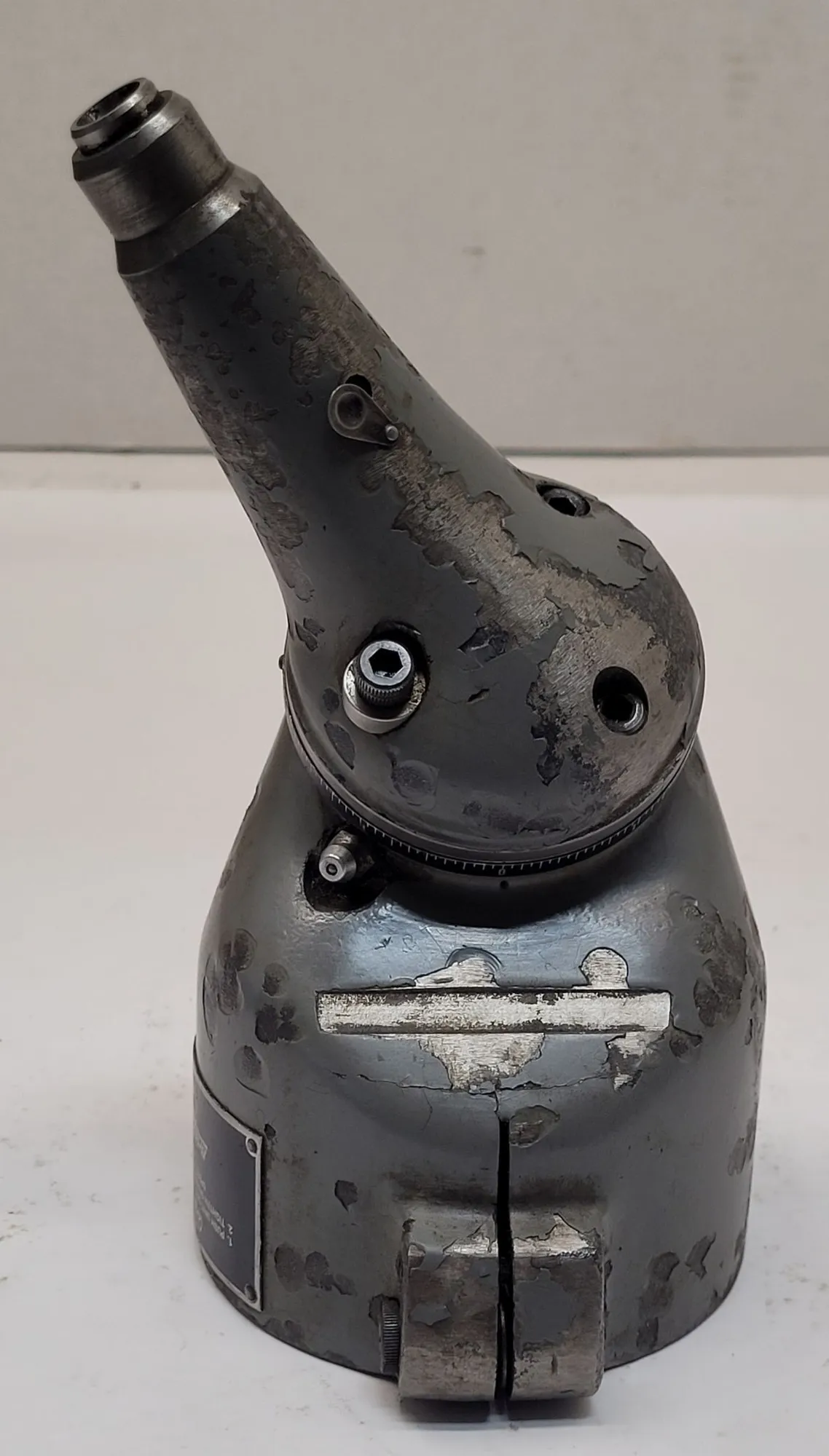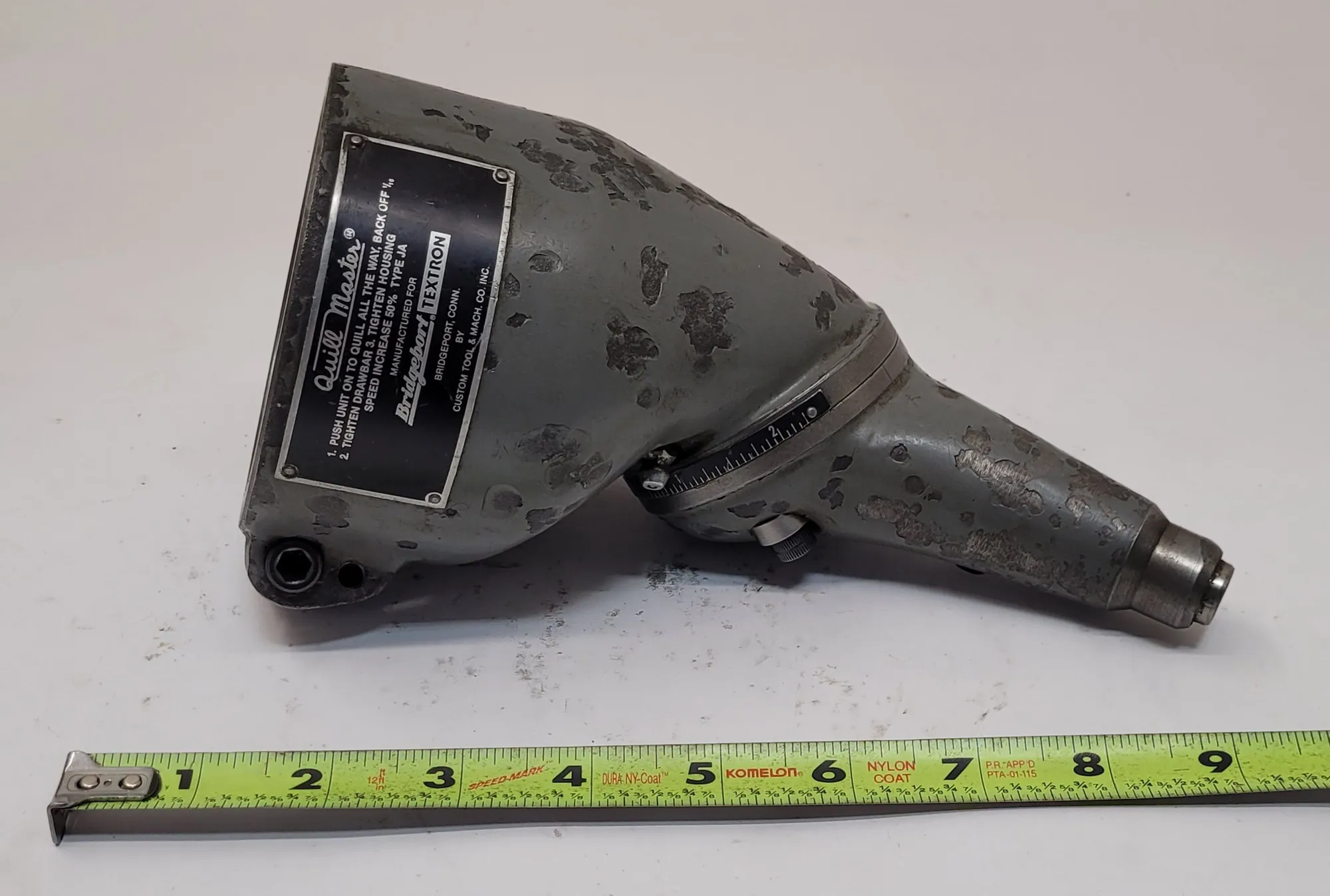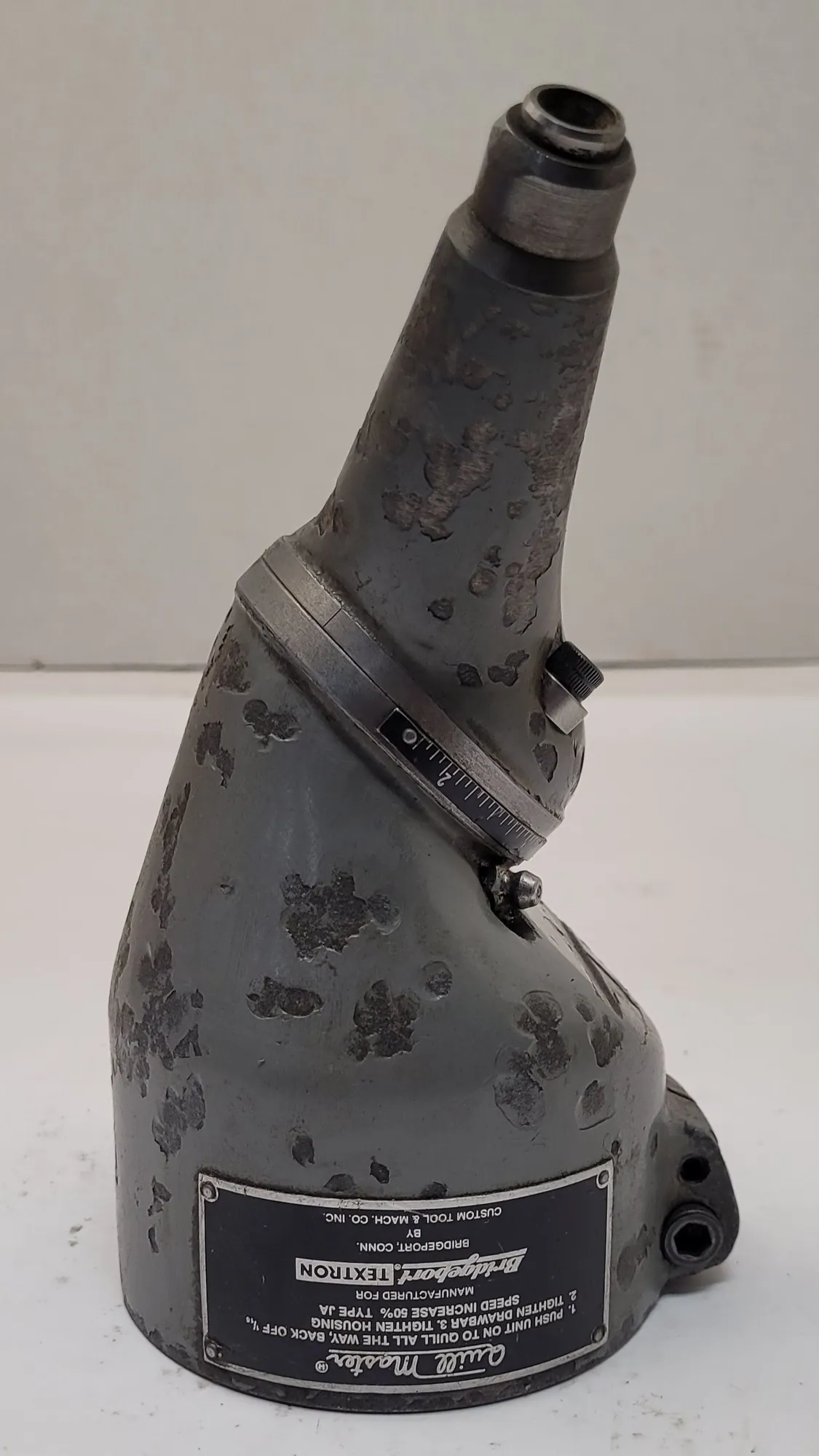 THE BRIDGEPORT TYPE JA QUILL MASTER IS A SPECIALIZED MILLING ATTACHMENT DESIGNED FOR SMALL MILLING, DRILLING, AND BORING OPERATIONS IN CONFINED AREAS OR AT VARIOUS ANGLES. THIS TOOL MOUNTS BY CLAMPING DIRECTLY ONTO THE QUILL OF A MILLING HEAD. IT FEATURES A 1/2 INCH DIAMETER DRIVE SHAFT, TYPICALLY DRIVEN BY AN R8 COLLET WITHIN THE SPINDLE. THE UNIT IS COMPATIBLE WITH COLLETS HAVING A 3/16 INCH DIAMETER CAPACITY.