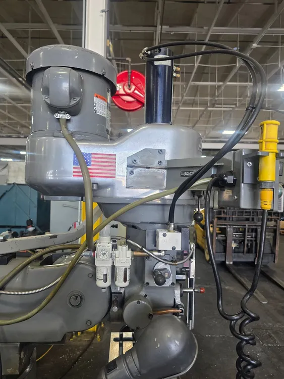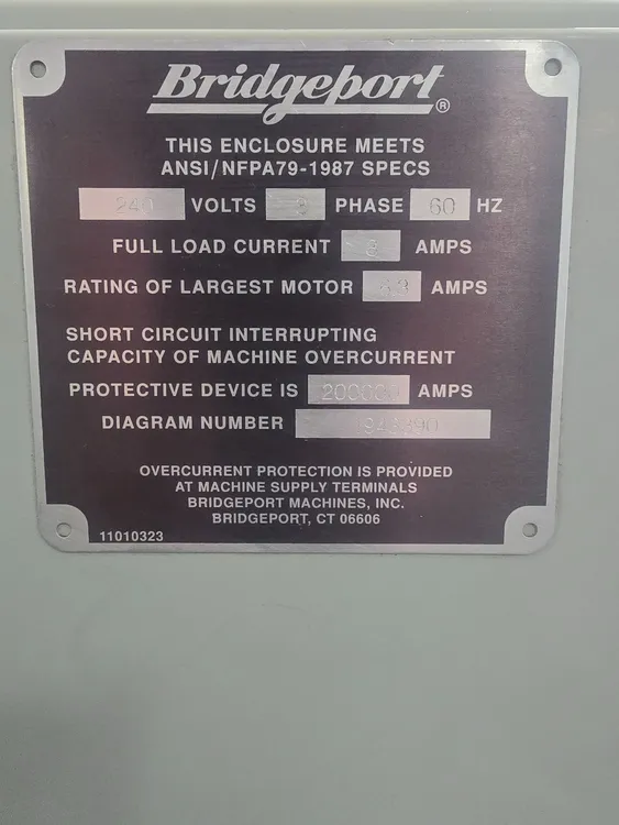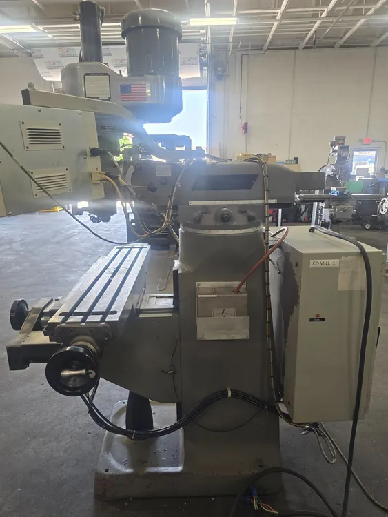 THIS IS A BRIDGEPORT SERIES 1 EZ TRAK DX VERTICAL CNC MILL FEATURING A 9" X 48" TABLE. THE MACHINE OFFERS A LONGITUDINAL (X-AXIS) TRAVEL OF 33.5 INCHES AND A CROSS (Y-AXIS) TRAVEL OF 12 INCHES. VERTICAL TRAVEL OF THE KNEE IS 14 INCHES, WITH AN ADDITIONAL QUILL TRAVEL OF 5 INCHES AND RAM TRAVEL OF 12 INCHES. THE MILL UTILIZES AN R8 TAPER SPINDLE DRIVEN BY A 2 HP/1735 RPM MOTOR. SPINDLE SPEEDS ARE INFINITELY VARIABLE, RANGING FROM 60 TO 4200 RPM. AVAILABLE SPINDLE QUILL FEEDS INCLUDE 0.0015", 0.003", AND 0.006". THE POSITIONING SPEED FOR THE X AND Y AXES IS 100 INCHES PER MINUTE, WITH A FEED RATE RANGE SPANNING FROM 0.1 TO 100 INCHES PER MINUTE. THE THROAT DEPTH ADJUSTS FROM 6-3/4" TO 18-3/4", AND THE DISTANCE FROM THE TABLE TO THE SPINDLE NOSE RANGES FROM 2-1/2" TO 18-1/4". ELECTRICAL REQUIREMENTS ARE 230V/460V, 3 PHASE, 60 CYCLES, WITH A CURRENT WIRING FOR 230V. APPROXIMATE DIMENSIONS ARE 70" X 77" X 87" HIGH, AND THE APPROXIMATE WEIGHT IS 3,000 LBS.