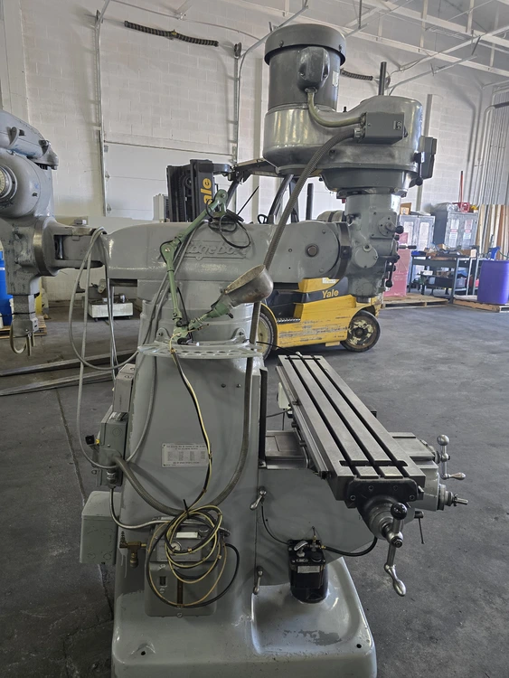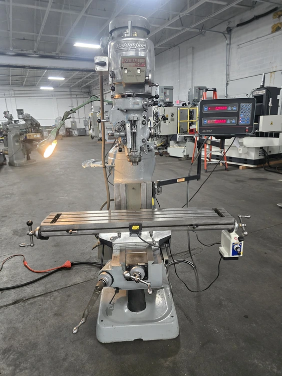 THE BRIDGEPORT SERIES 1 IS A VERTICAL MILL FEATURING A 42 X 9 INCH WORKING SURFACE. ITS TRAVEL CAPACITIES INCLUDE 31 INCHES (787MM) ON THE X-AXIS, 12 INCHES (305MM) ON THE Y-AXIS, 5 INCHES (127MM) OF QUILL TRAVEL, AND 16 INCHES (406MM) OF KNEE TRAVEL (Z-AXIS). THE MACHINE CAN HANDLE A MAXIMUM WORKPIECE WEIGHT OF 750 LBS (340KG). THE SPINDLE, HOUSED IN A 2J HEAD, OPERATES WITH A CONTINUOUS AC POWER RATING OF 2 HP (1.5 KW) AND UTILIZES AN R-8 TAPER. THE INFINITELY VARIABLE SPEED RANGE COVERS 500 – 4200 RPM ON HIGH AND 60 – 500 RPM ON LOW, BOTH AT 60 HZ. POWER QUILL FEED IS AVAILABLE IN THREE RATES: 0.0015, 0.003, AND 0.006 IN./REV. PERFORMANCE SPECIFICATIONS INCLUDE A 3/8 INCH (9.5MM) DRILLING CAPACITY, 2 CI/MIN MILLING CAPACITY IN MILD STEEL, AND A 6 INCH DIAMETER (152MM) BORING RANGE IN MILD STEEL. THE MACHINE HAS A NET WEIGHT OF 1930 LBS (875KG) AND OCCUPIES A FLOOR AREA OF 8.3 X 7.8 FT. (2.53 X 2.4M). IT REQUIRES 208/230/460 VOLTS, 3 PHASE, 50/60 CYCLE INPUT POWER, WITH A 4KVA POWER CAPACITY.