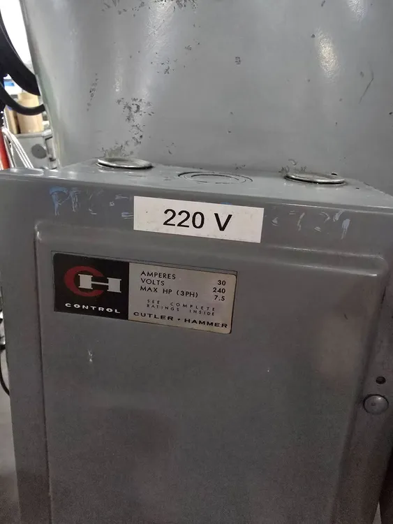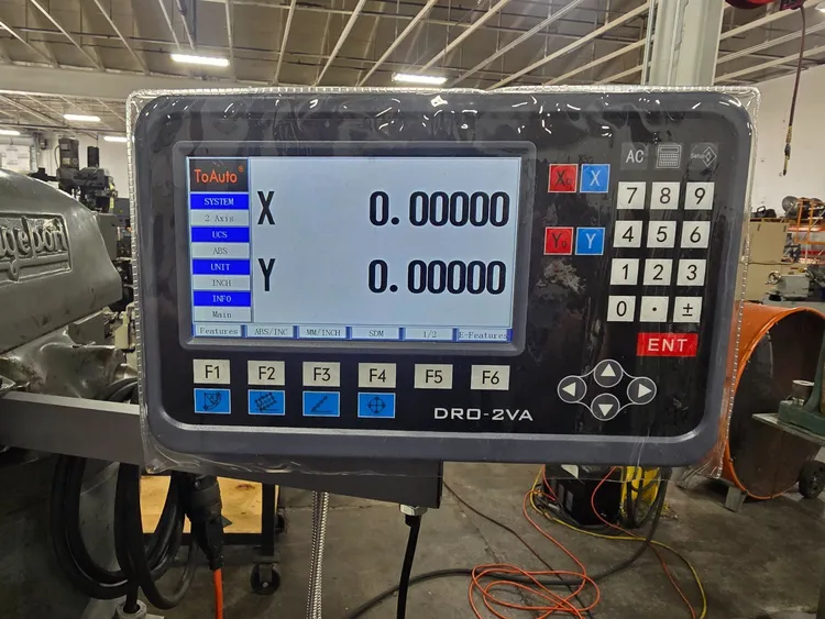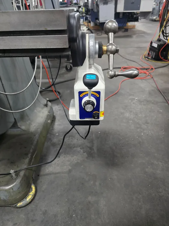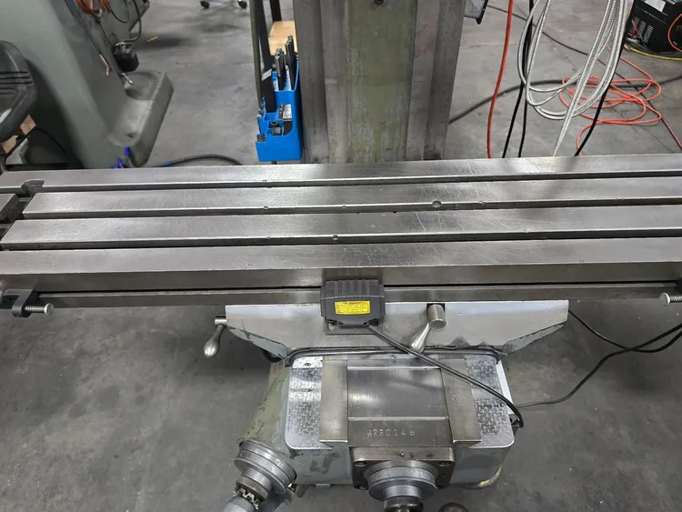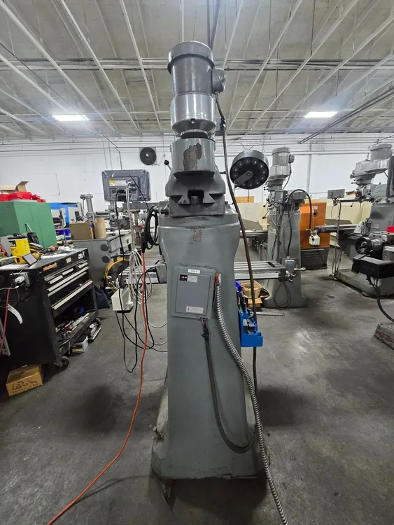 THIS BRIDGEPORT SERIES 1 VERTICAL MILL FEATURES A 9 INCH BY 48 INCH WORKING TABLE SURFACE WITH A MAXIMUM WORKPIECE CAPACITY OF 750 POUNDS. THE MACHINE PROVIDES X-AXIS TRAVEL OF 30 INCHES WITH POWER FEED, Y-AXIS SADDLE TRAVEL OF 12 INCHES, AND Z-AXIS KNEE TRAVEL OF 16 INCHES, WITH A QUILL TRAVEL OF 5 INCHES. THE MILL UTILIZES A 2 HP SPINDLE WITH AN R-8 TAPER AND ACCEPTS R-8 COLLETS. SPINDLE DIAMETER IS 1.875 INCHES AND QUILL DIAMETER IS 3.375 INCHES. THE INFINITELY VARIABLE SPINDLE SPEED RANGE OPERATES AT 500 TO 4200 RPM IN HIGH GEAR AND 60 TO 500 RPM IN LOW GEAR, BOTH AT 60 HZ. POWER QUILL FEED IS AVAILABLE IN THREE RATES: 0.0015, 0.003, AND 0.006 INCHES PER REVOLUTION. POSITIONING FEEDRATE RANGE FOR X AND Y AXES IS 0.50 TO 35 INCHES PER MINUTE. CAPACITIES INCLUDE A 3/8 INCH DRILLING CAPACITY AND A 6 INCH DIAMETER BORING RANGE IN MILD STEEL. THE CONTROL SYSTEM IS CNC WITH A TOAUTO DRO. POWER INPUT REQUIREMENTS ARE 208/230/460 VOLTS, 3 PHASE, 50/60 CYCLE, CURRENTLY WIRED FOR 230V, WITH A POWER CAPACITY OF 4KVA. THE NET WEIGHT OF THE MILL IS 1930 POUNDS AND ITS FLOOR AREA IS 5.3 X 5.8 FEET, WITH AN OVERALL HEIGHT OF 87 INCHES.