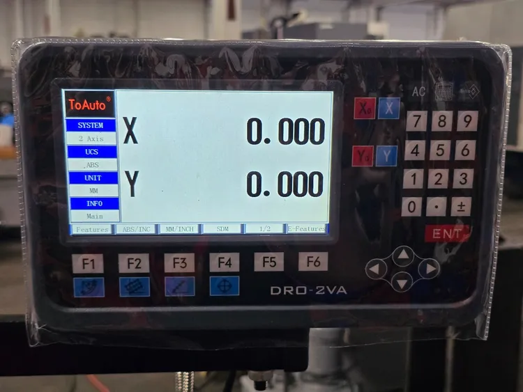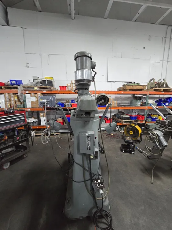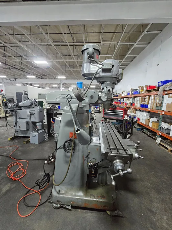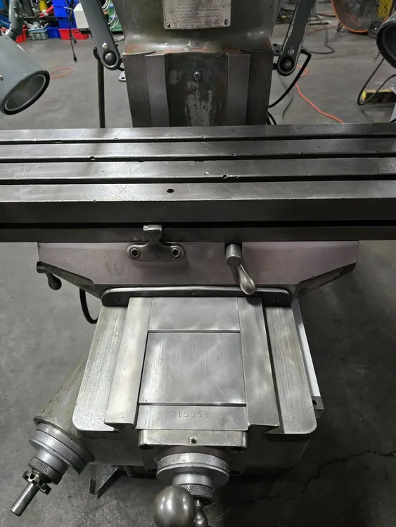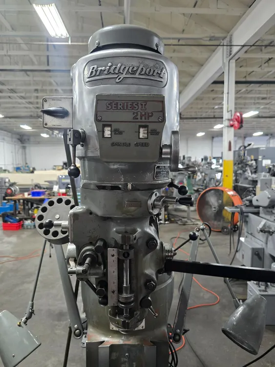 THIS BRIDGEPORT SERIES 1 IS A VERTICAL MILL FEATURING A WORK SURFACE DEFINED BY A 9-INCH WIDE AND 48-INCH LONG TABLE. THE TRAVEL CAPABILITIES INCLUDE 31 INCHES OF LONGITUDINAL MOVEMENT AND 12 INCHES OF CROSS MOVEMENT. POWER IS SUPPLIED BY A 2 HP MOTOR, PROVIDING A MAXIMUM SPEED OF 4,200 RPM, AND THE SPINDLE IS CONFIGURED WITH AN R8 TAPER. KEY FEATURES INCLUDE A VARIABLE SPEED 2J HEAD, A TOAUTO DIGITAL READOUT (DRO), CHROME WAYS, A BIJUR ONE SHOT LUBE SYSTEM, AND A WORK LIGHT. THE MACHINE REQUIRES 230 VOLTS 3 PHASE INPUT POWER AND HAS A 4KVA POWER CAPACITY. THE OVERALL DIMENSIONS ARE APPROXIMATELY 5 FEET BY 5 FEET BY 7 FEET, WITH AN APPROXIMATE OPERATING WEIGHT OF 2100 LBS.