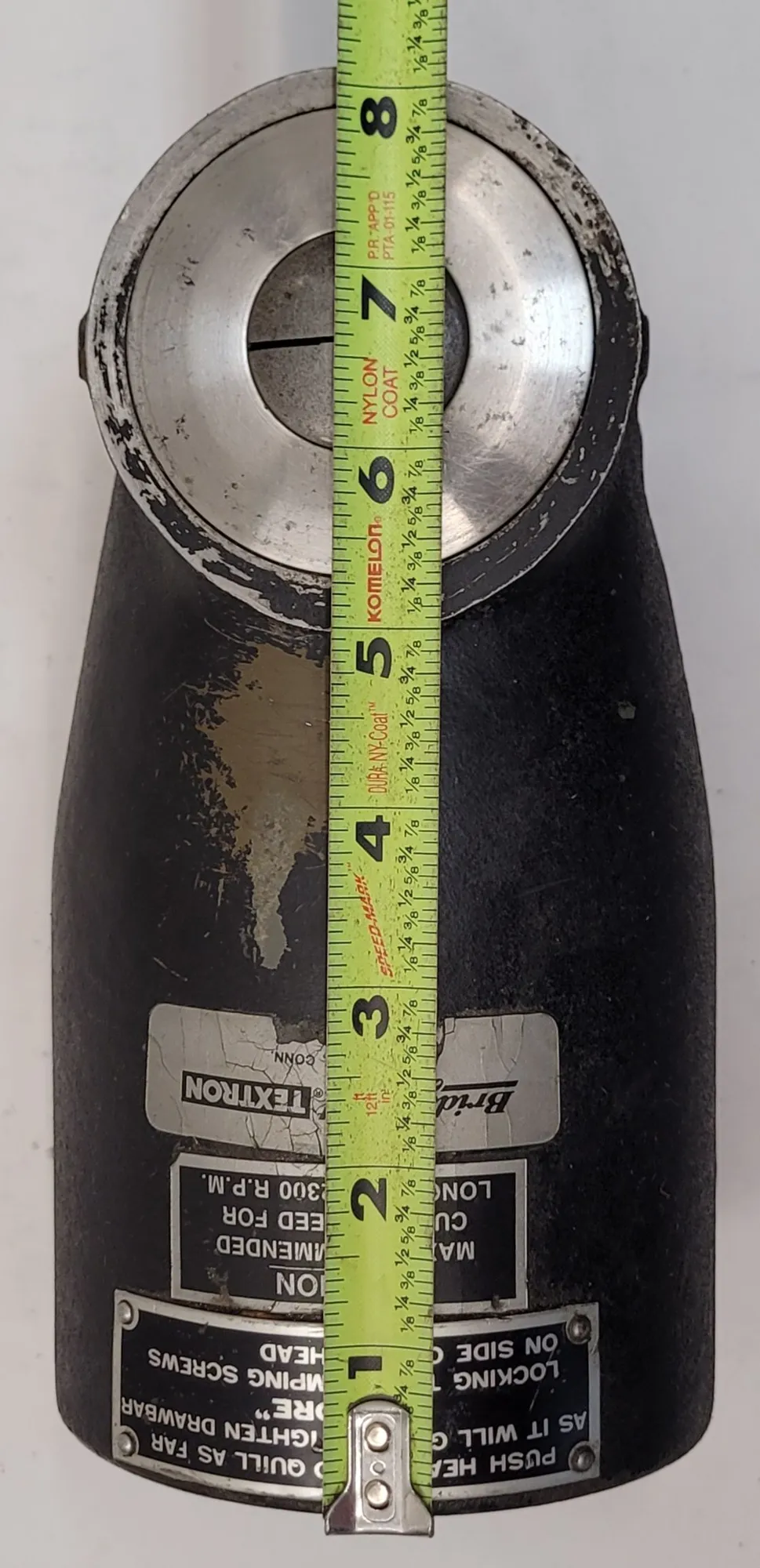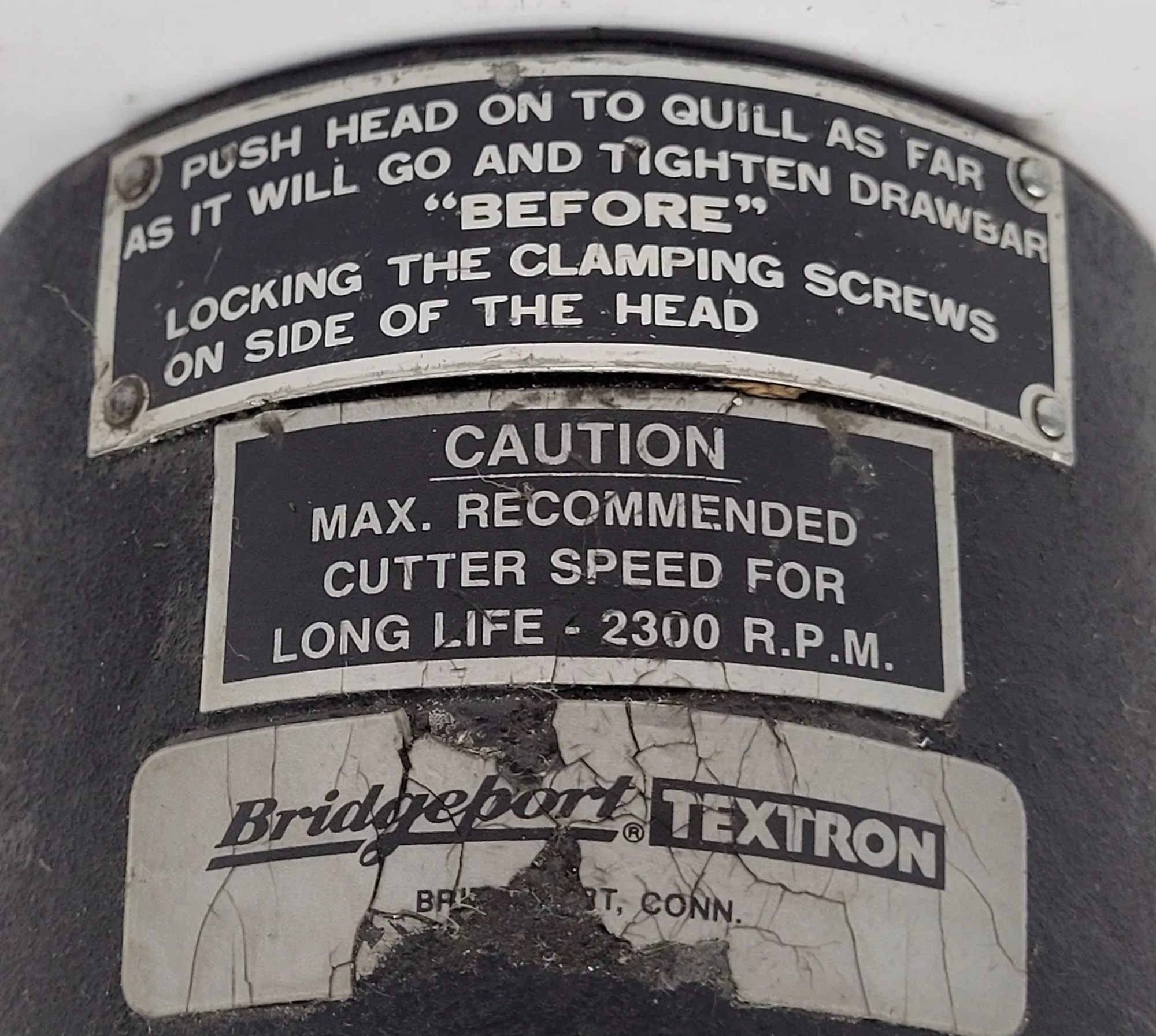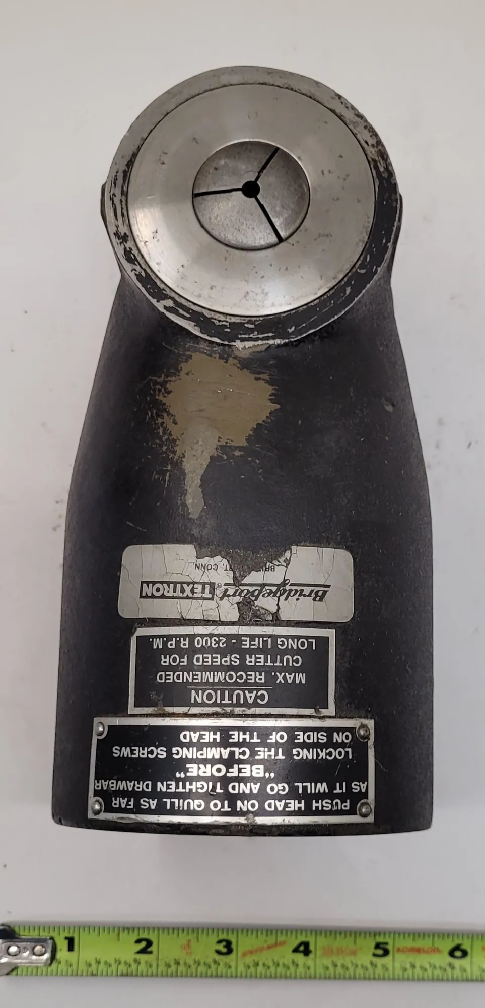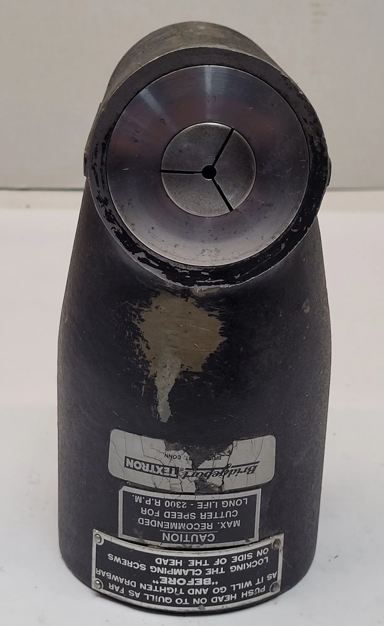 THE BRIDGEPORT TEXTRON RIGHT ANGLE HEAD IS DESIGNED FOR BRIDGEPORT MILLING APPLICATIONS. THIS ATTACHMENT FEATURES A MAXIMUM OPERATING SPEED OF 2300 RPM. TECHNICAL DIMENSIONS INCLUDE A TOTAL HEIGHT OF 8-1/4 INCHES AND AN OUTER HEAD DIAMETER (OD) OF 3-1/8 INCHES.