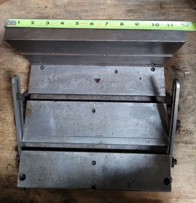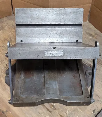 THE BRIDGEPORT TRI-SINE TABLE TITLED ANGLE PLATE IS A PRECISE PIECE OF TOOLING. THE SPECIFICATIONS INDICATE T-SLOTTED SURFACE DIMENSIONS OF 10 INCHES BY 12 INCHES AND 6 INCHES BY 12 INCHES. THE ANGLE PLATE IS EASILY ADJUSTABLE USING A 1/4-INCH ALLEN WRENCH.