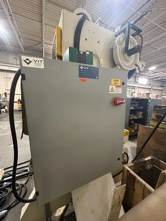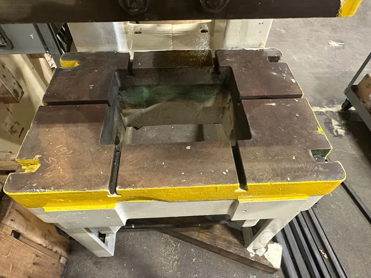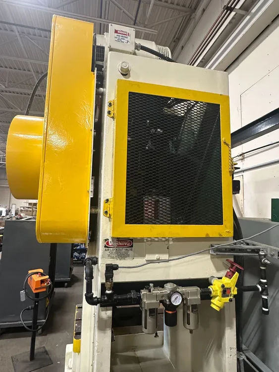 THIS IS A BROWN & BOGGS 60 TON PRESS, MODEL 60, EQUIPPED WITH A WINTRISS WPC 2000 CLUTCH/BRAKE CONTROL. THE PRESS OPERATES ON 575V 60HZ 3PH POWER WITH A TOTAL HP OF 5 HP, DELIVERING 60T OF TONNAGE. KEY DIMENSIONS INCLUDE A 5-INCH STROKE, A 9.5-INCH SHUT HEIGHT, AND 3 INCHES OF ADJUSTMENT. THE BED AREA MEASURES 32 INCHES L-R BY 22.5 INCHES F-B, WHILE THE RAM AREA IS 21 INCHES L-R BY 16 INCHES F-B. THE MACHINE CAN ACHIEVE 90 STROKES PER MINUTE, REQUIRING 80 PSI FOR BOTH BRAKE AIR PRESSURE AND CLUTCH AIR PRESSURE. THE WINTRISS WPC 2000 CONTROL UNIT OPERATES WITH A SUPPLY VOLTAGE OF 600 VAC 60HZ 3PH, A CONTROL VOLTAGE OF 110VAC/24VDC, A SHORT CIRCUIT RATING OF 5KA, AND FULL LOAD AMPS OF 7.5A. THE MACHINE WEIGHS 12,500 LBS AND HAS OVERALL DIMENSIONS OF 61 INCHES X 86 INCHES X 130 INCHES.