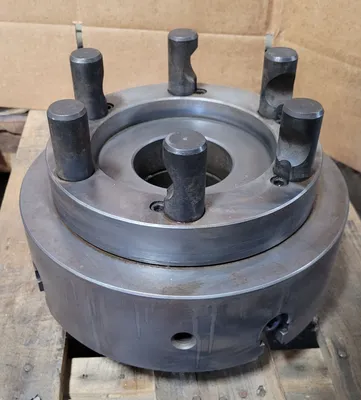 THIS IS A BUCK 10-INCH, 4 JAW CHUCK FEATURING AN OVERALL DIAMETER OF 10 INCHES AND FOUR JAWS. IT UTILIZES A D1-8 MOUNT ON THE BACK WITH 6 PINS. THE CHUCK IS EQUIPPED WITH A THROUGH HOLE MEASURED AT 3 INCHES, MAKING IT SUITABLE FOR LATHE APPLICATIONS.