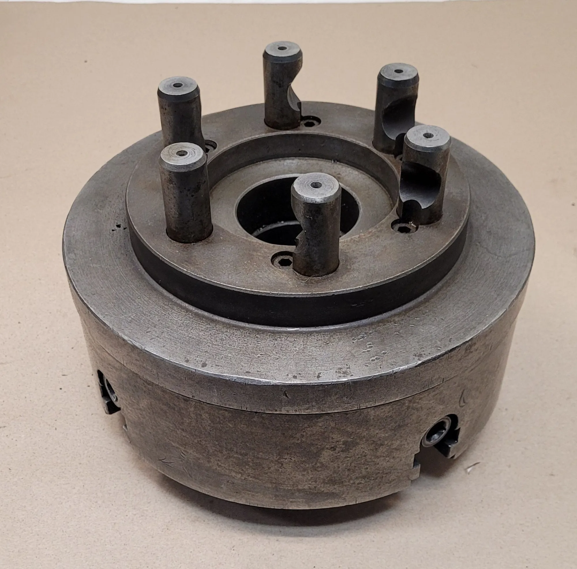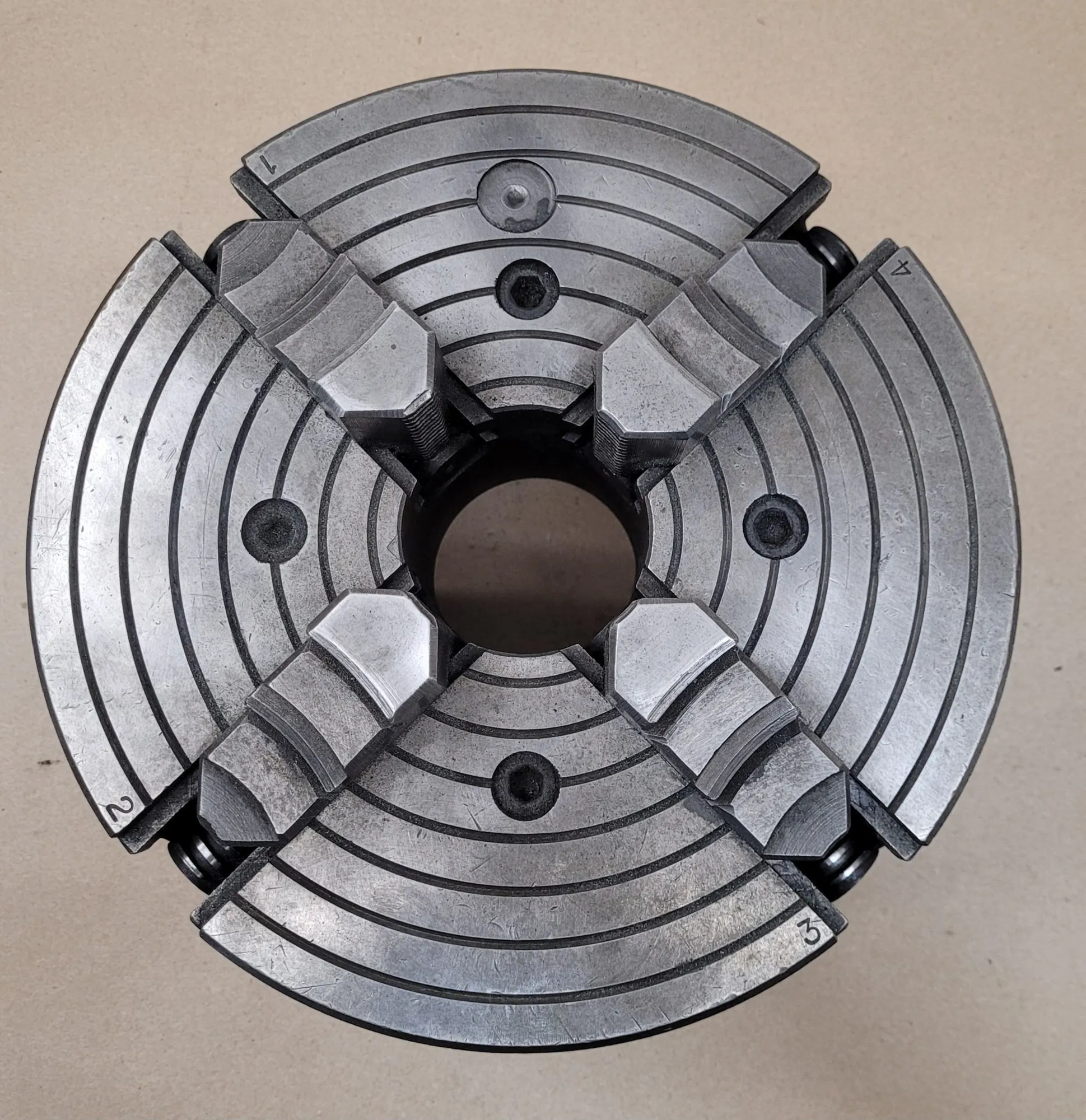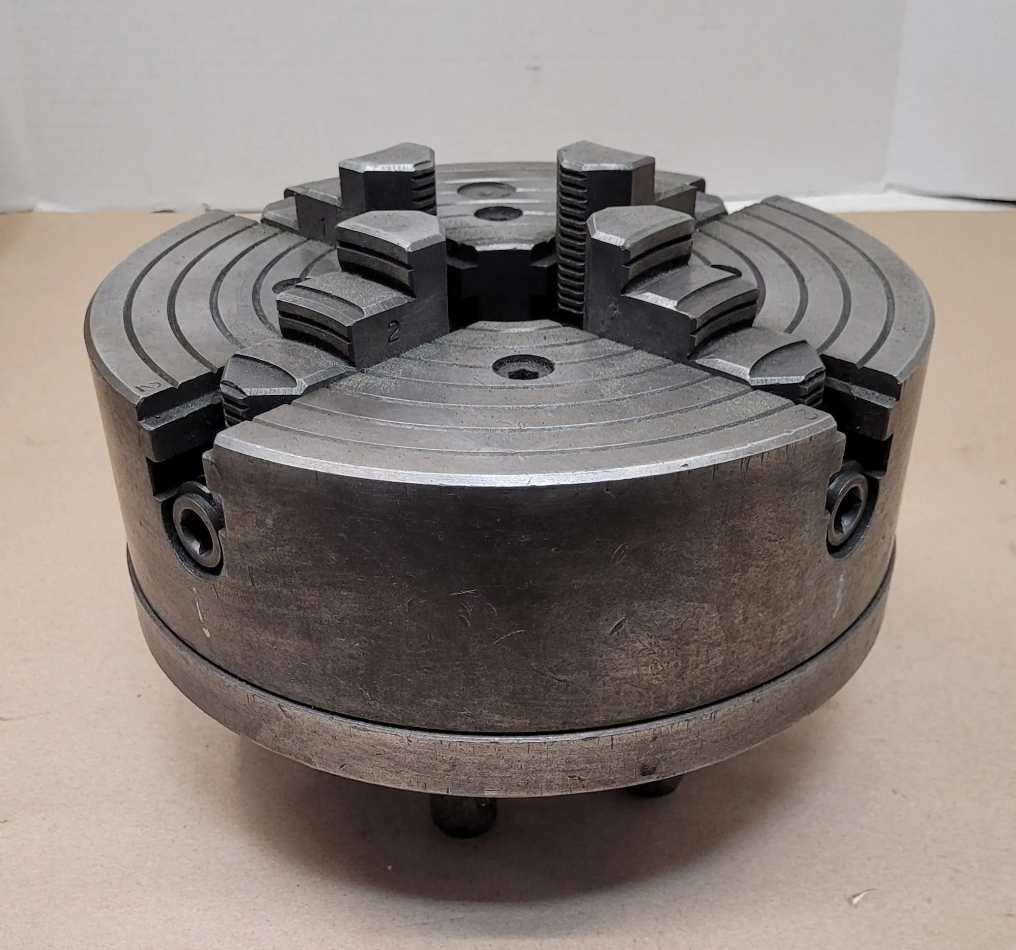BUCK 10-INCH 4-JAW LATHE CHUCK, D1-6 BACK PLATE, 2-3/8" BORE, SIX 0.875" PINS, KEY INCLUDED