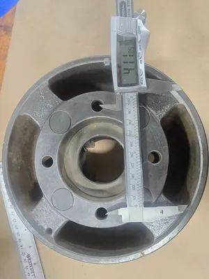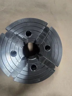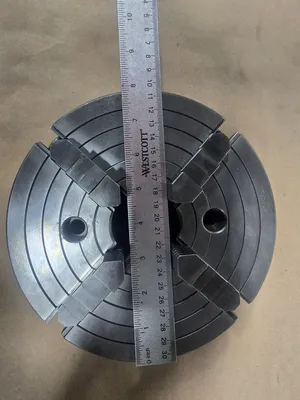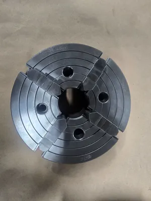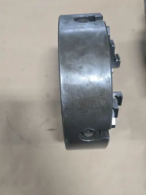 THIS IS AN 8-INCH, 4-JAW LATHE CHUCK MANUFACTURED BY BUCK. IT FEATURES A PLAIN BACK MOUNTING STYLE AND FITS ONTO A 3.17-INCH SPINDLE NOSE. THE CHUCK IS EQUIPPED WITH A 2-INCH THROUGH-HOLE.