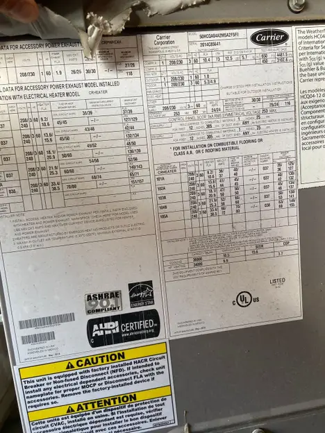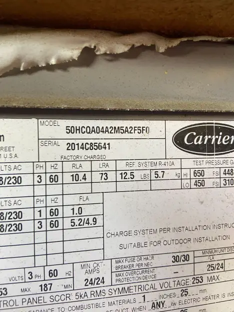 QTY 1: 2014 CARRIER 50HCQA04A2M5A2F5F0 ROOF TOP AC UNIT, SERIAL: 2014C85641, HZ: 60, PHASE: 3, VOLTAGE: 208/230 V, APPROXIMATE DIMENSIONS: 126" L x 48" W x 49" H, 1850 LBS