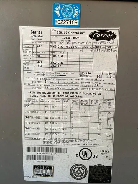 QTY 1: 2007 CARRIER 50HJQ007H--621RY ROOF TOP AC UNIT, SERIAL: 1703620073, HZ: 60, PHASE: 3, VOLTAGE: 460 V, APPROXIMATE DIMENSIONS: 108" L x 48" W x 49" H, 1200 LBS