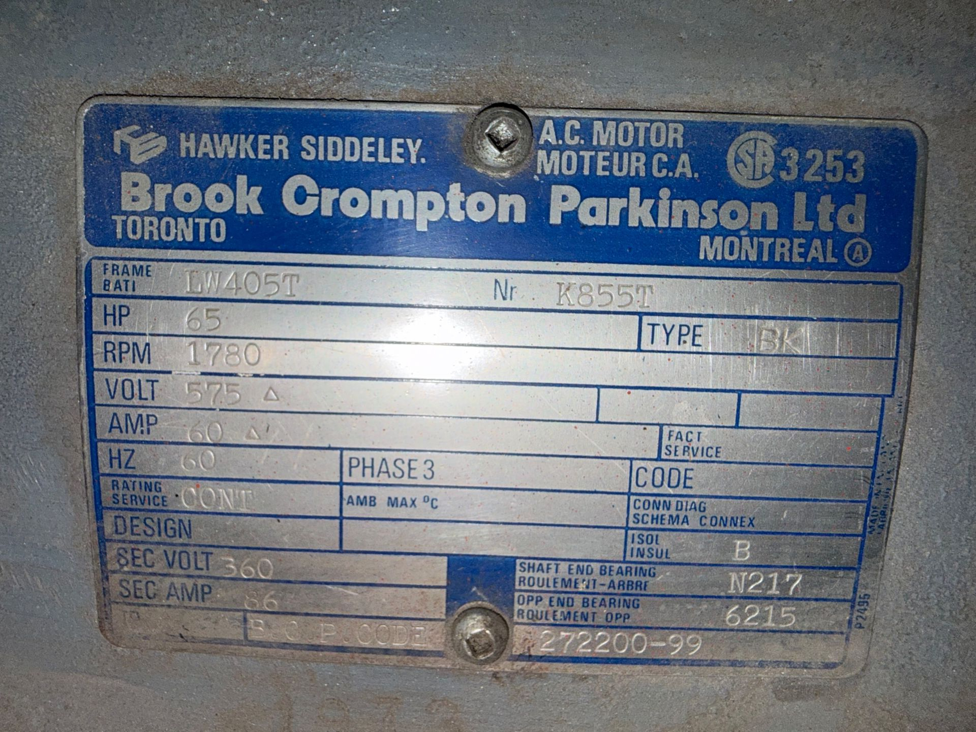 - BROOK CROMPTON PARKINSON LTD 65 HP / 575 V / 60 HZ / 3 PH / 1780 RPM
