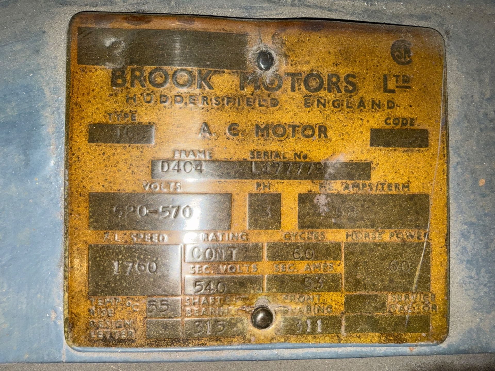 - BROOK MOTORS LTD 60 HP / 520-570 V / 60 HZ / 3 PH / 1760 RPM