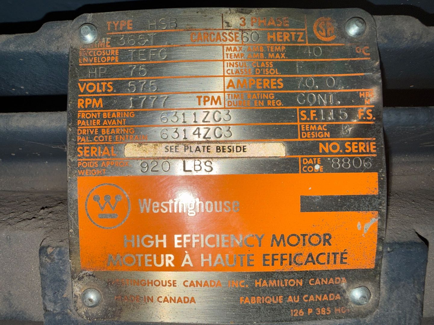 - WESTINGHOUSE 75 HP / 575 V / 60 HZ / 3 PH / 1777 RPM