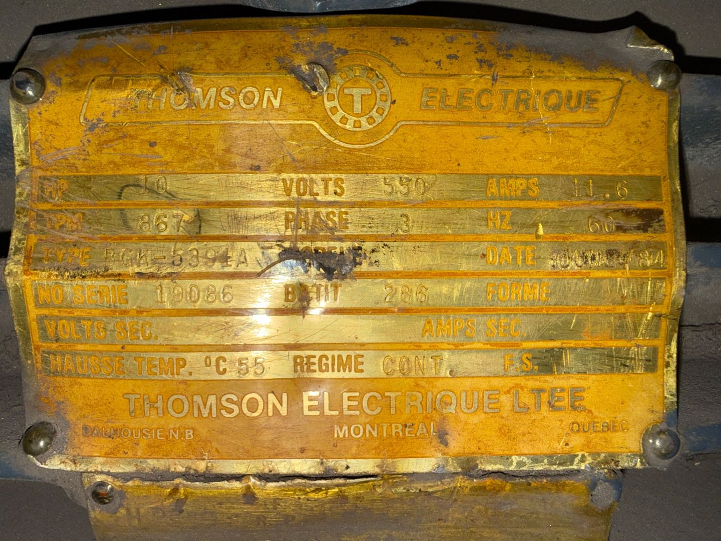 - THOMSON ELECTRIQUE 10 HP / 550 V / 60 HZ / 3 PH / 867 RPM