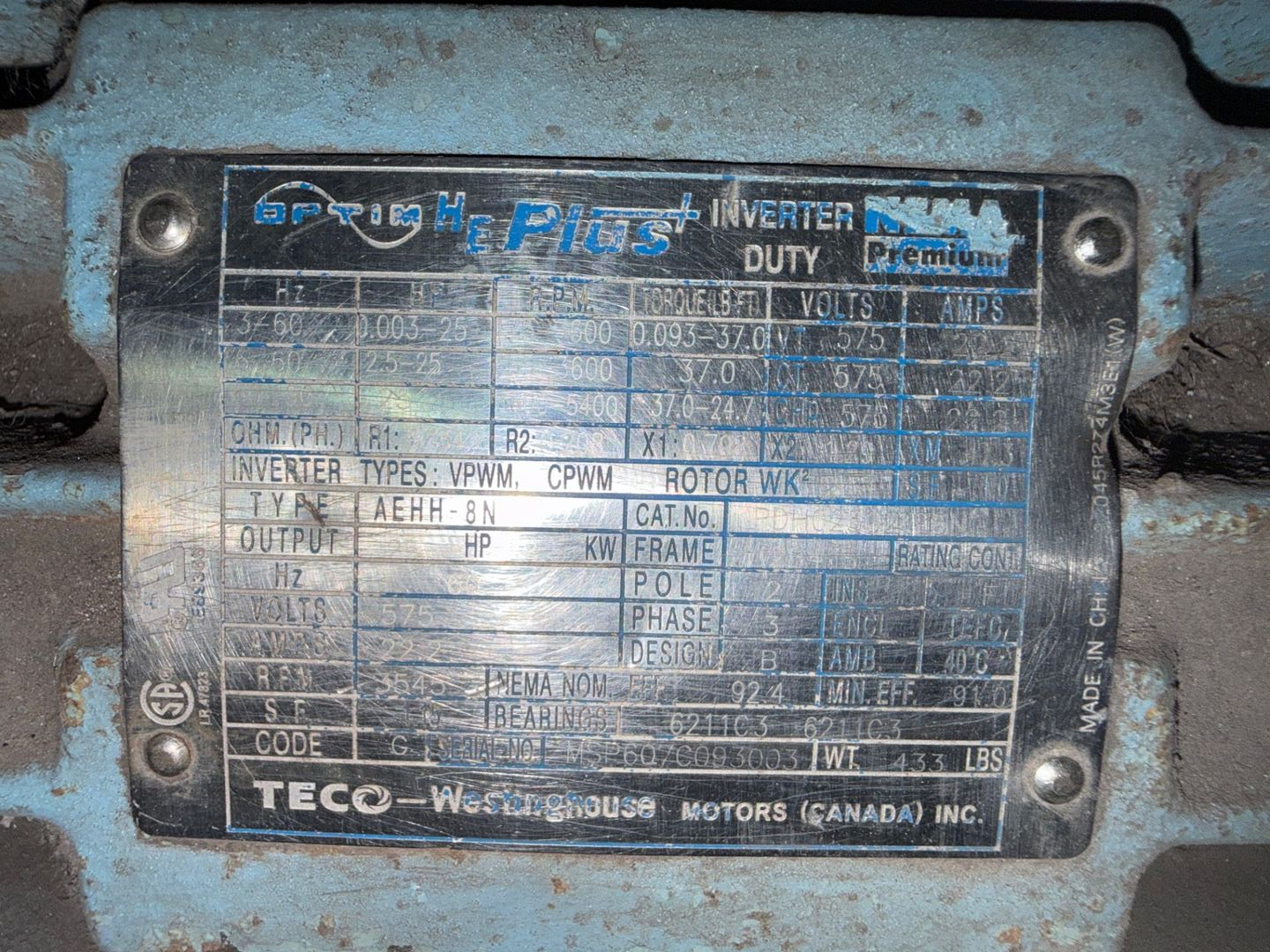 - TECO WESTINGHOUSE 575 V / 3 PH / 3545 RPM