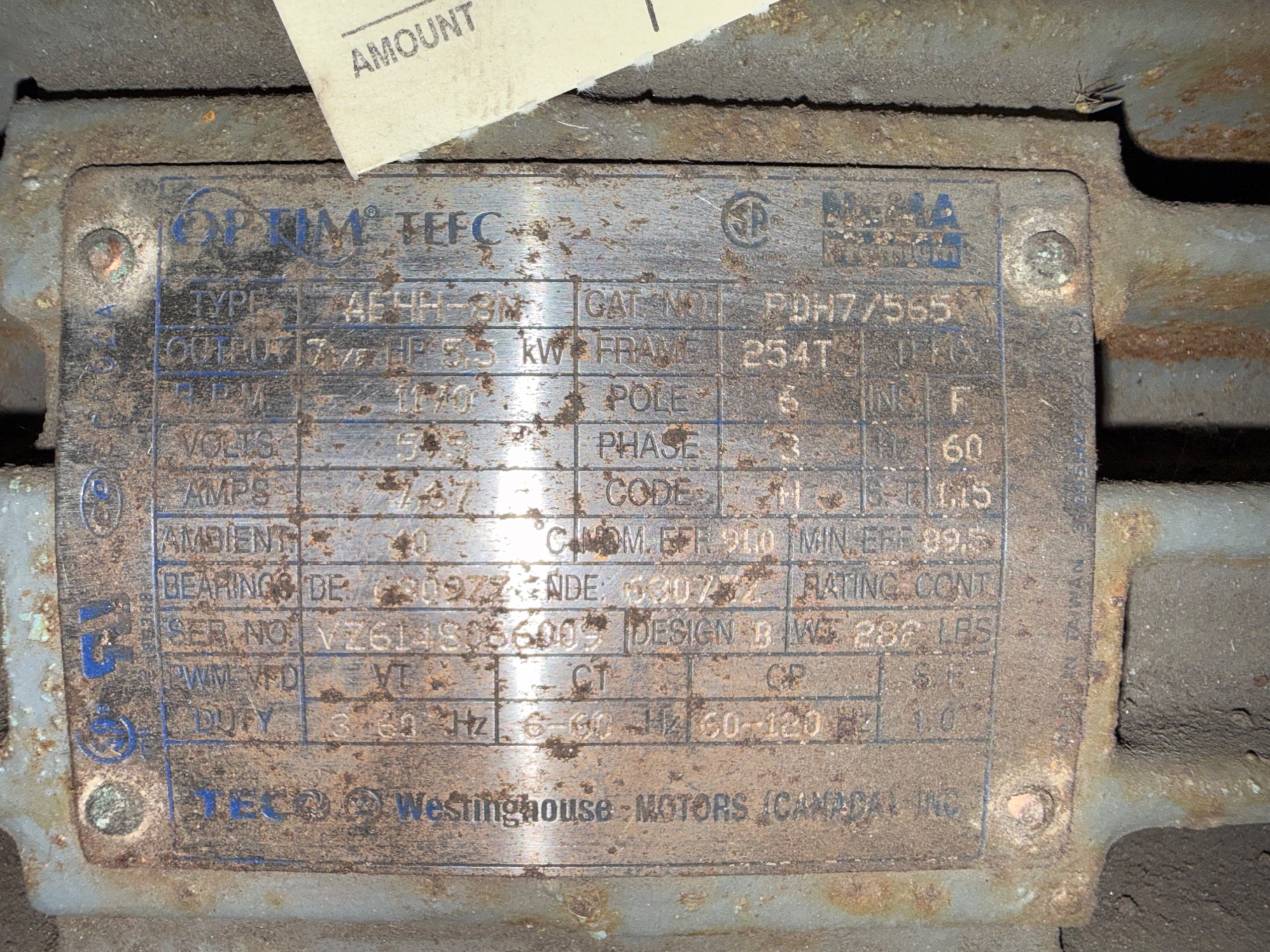 - TECO WESTINGHOUSE 7 1/2 HP / 575 V / 60 HZ / 3 PH / 1170 RPM