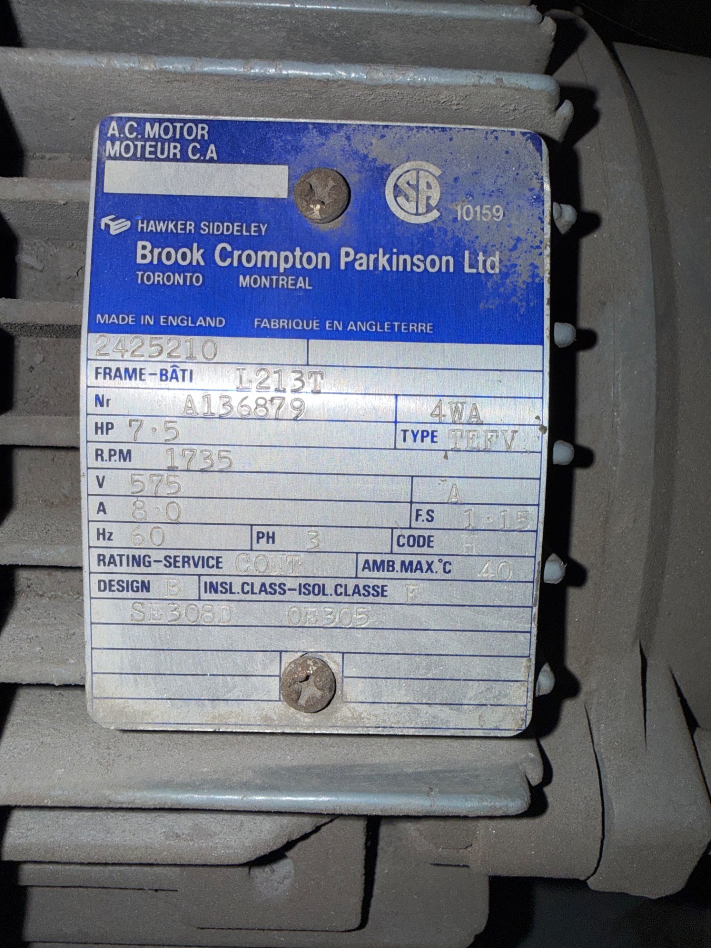 - BROOK CROMPTON 7.5 HP / 575 V / 60 HZ / 3 PH / 1735 RPM