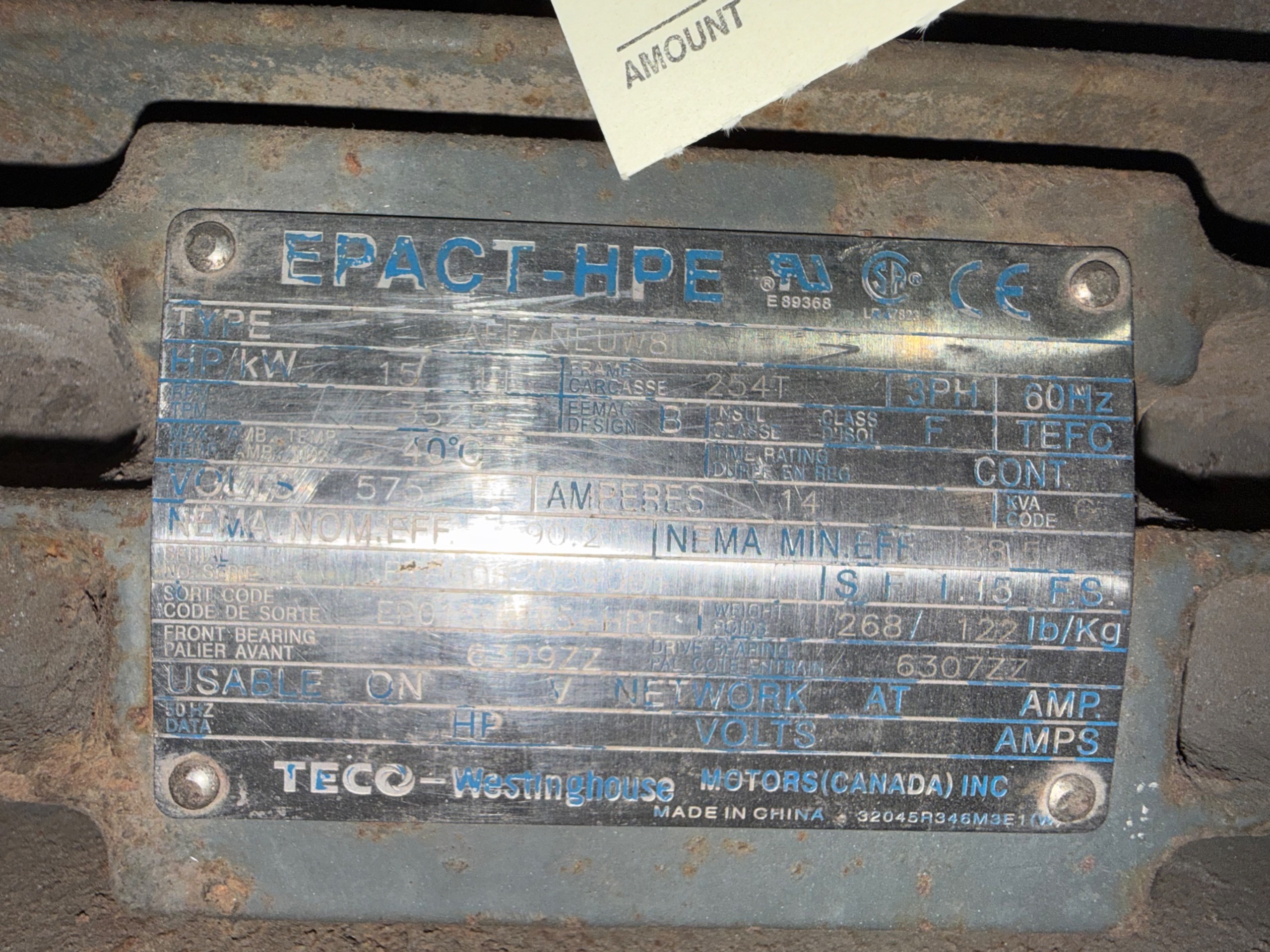- TECO WESTINGHOUSE 15 HP / 575 V / 60 HZ / 3 PH / 3525 RPM