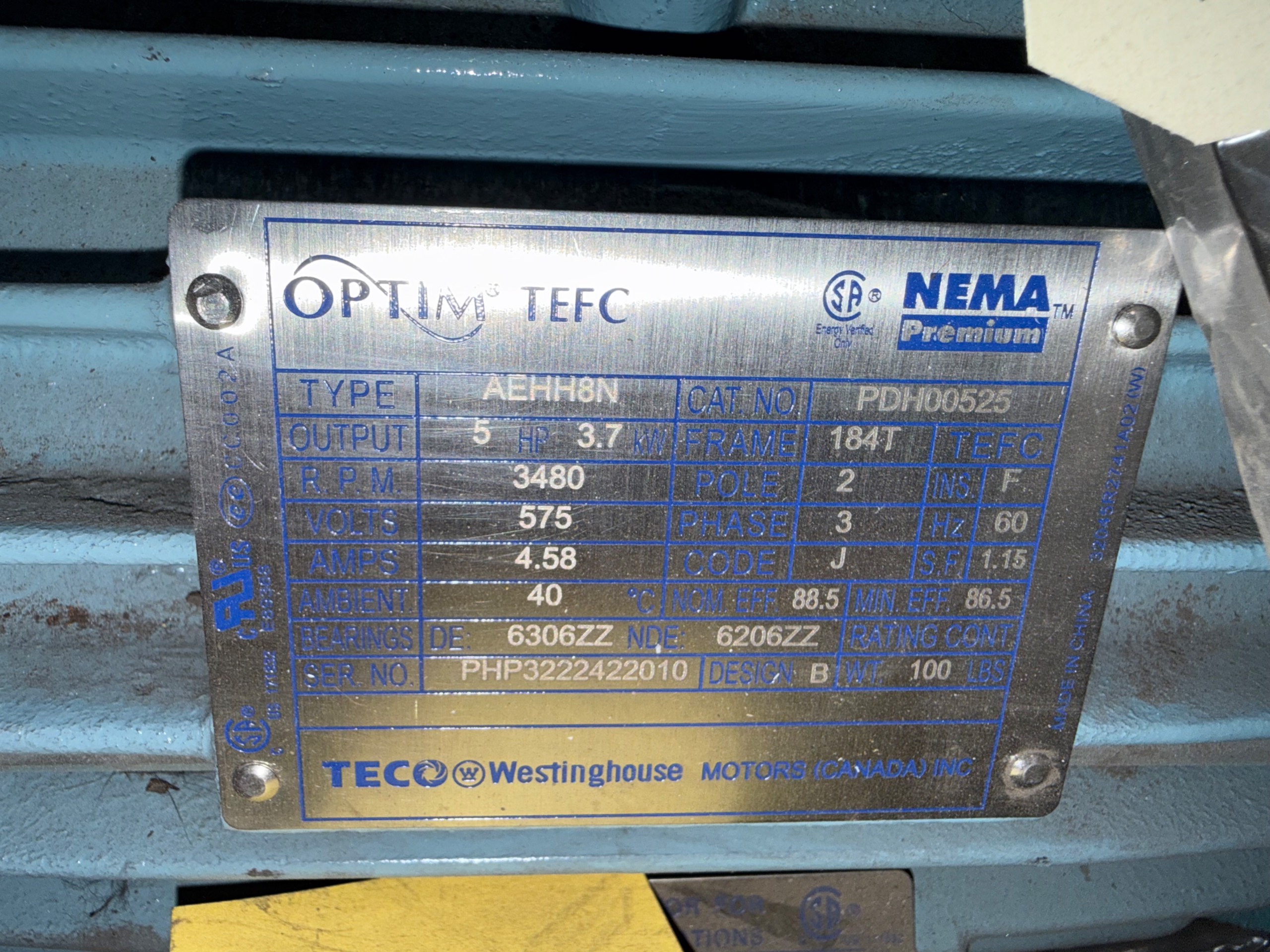 - TECO WESTINGHOUSE 5 HP / 575 V / 60 HZ / 3 PH / 3480 RPM