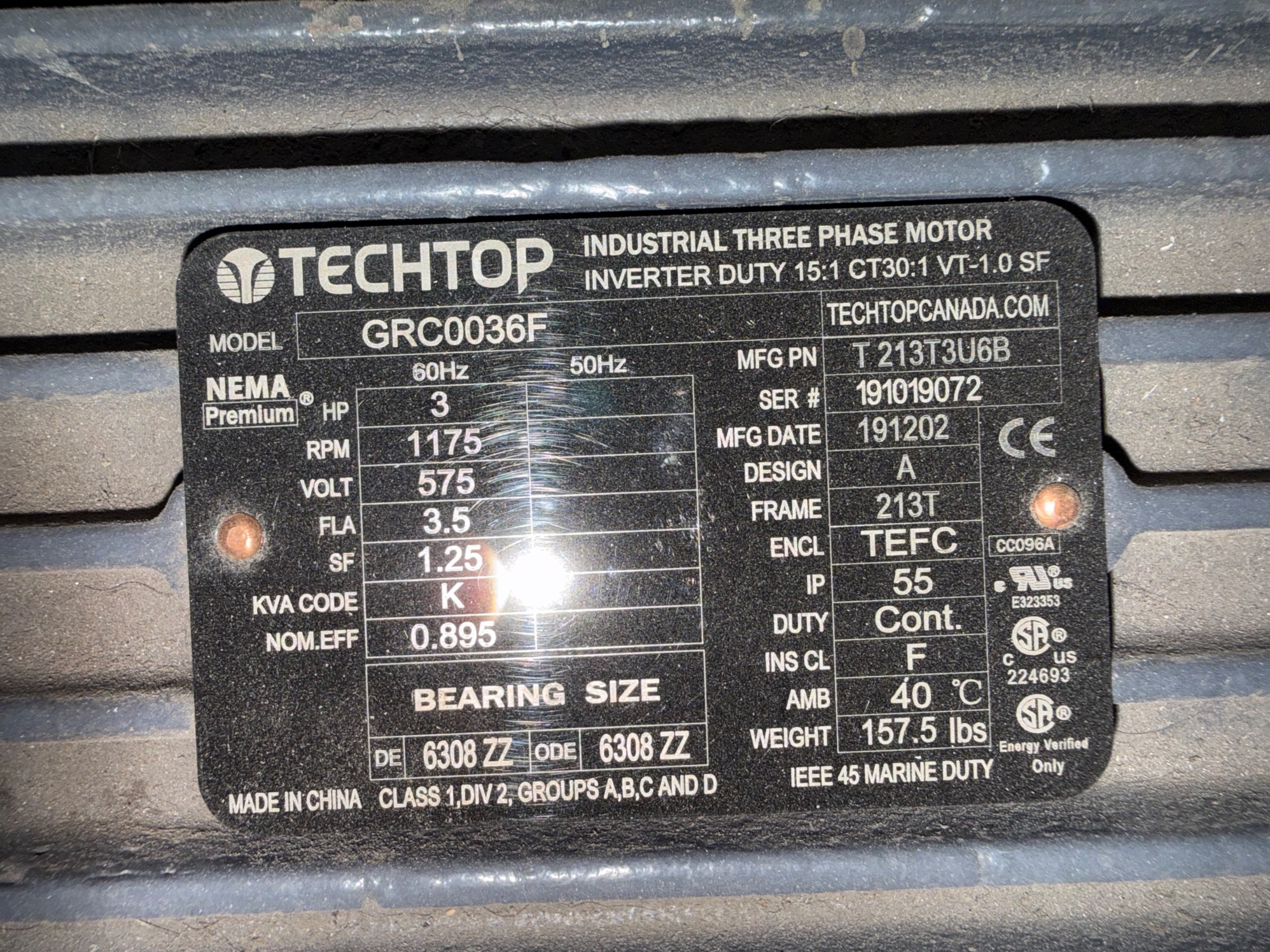 - TECHTOP 3 HP / 575 V / 60 HZ / 1175 RPM