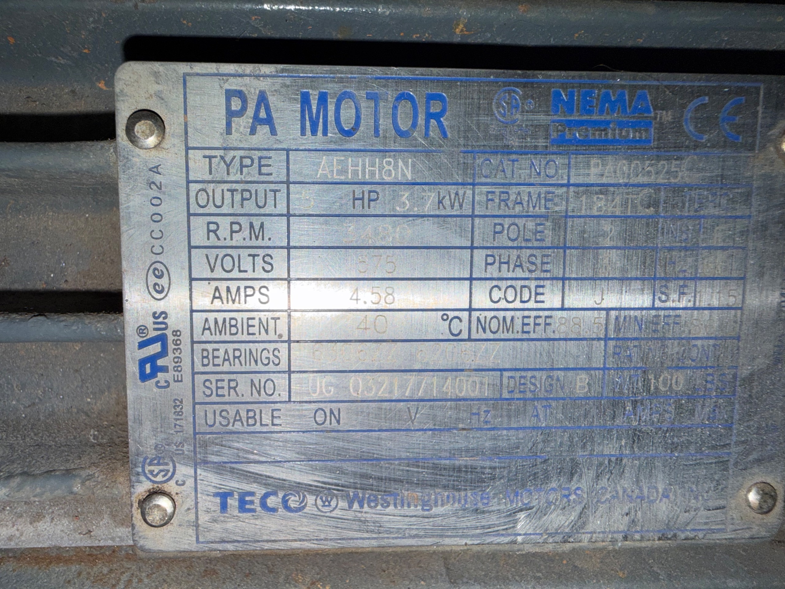 - TECO WESTINGHOUSE 5 HP / 575 V / 3480 RPM
