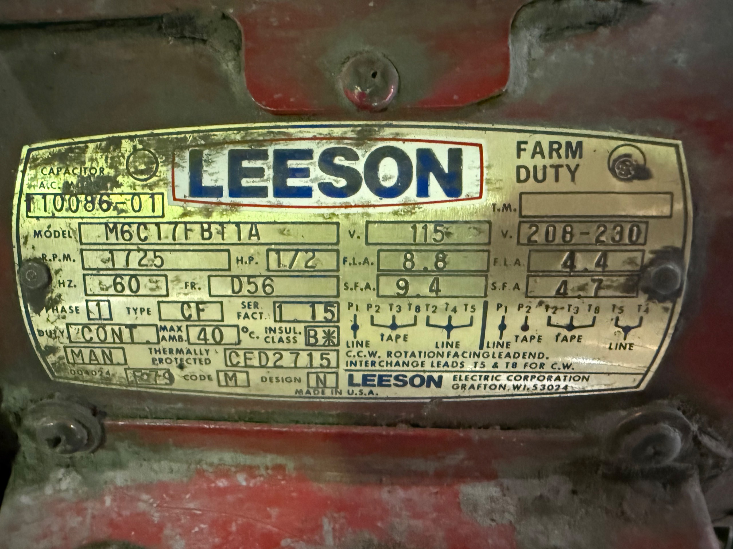 - LEESON 0.5 HP / 208-230 V / 60 HZ / 1 PH / 1725 RPM