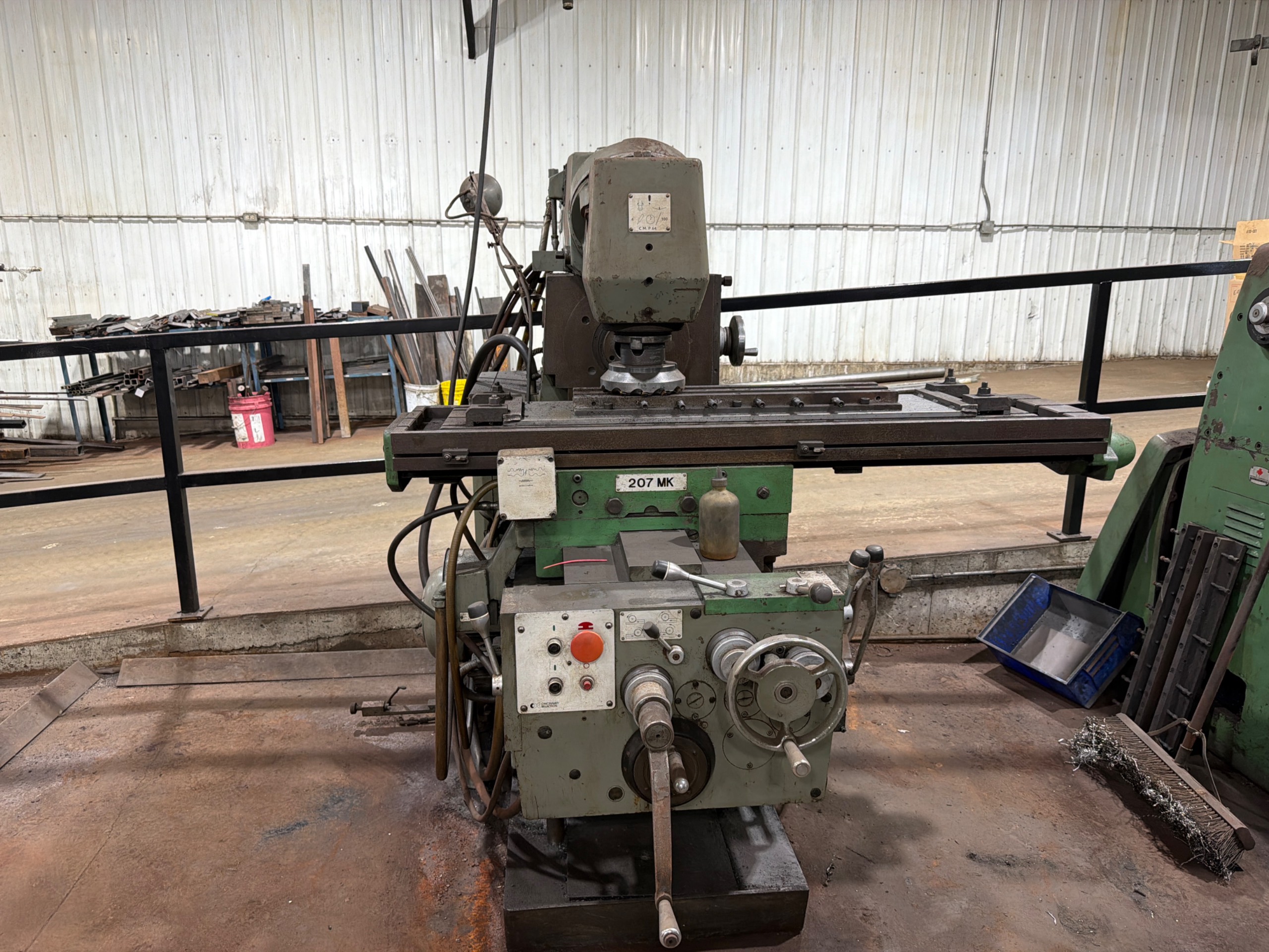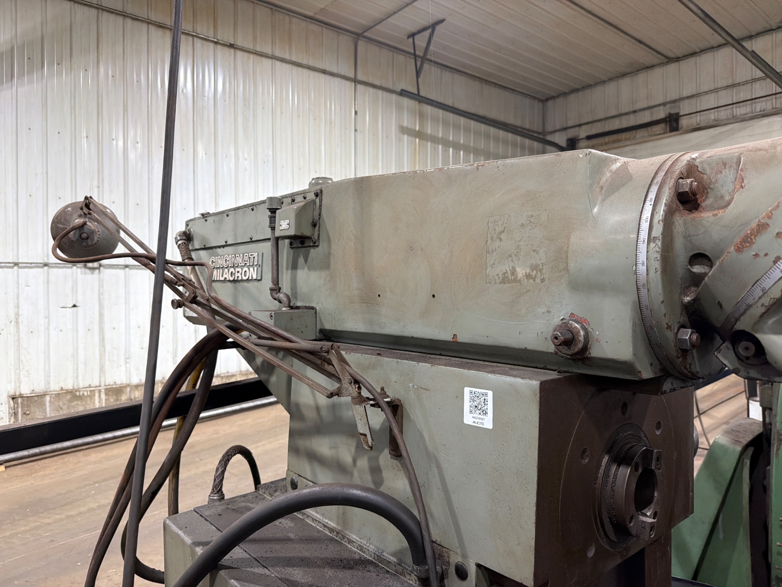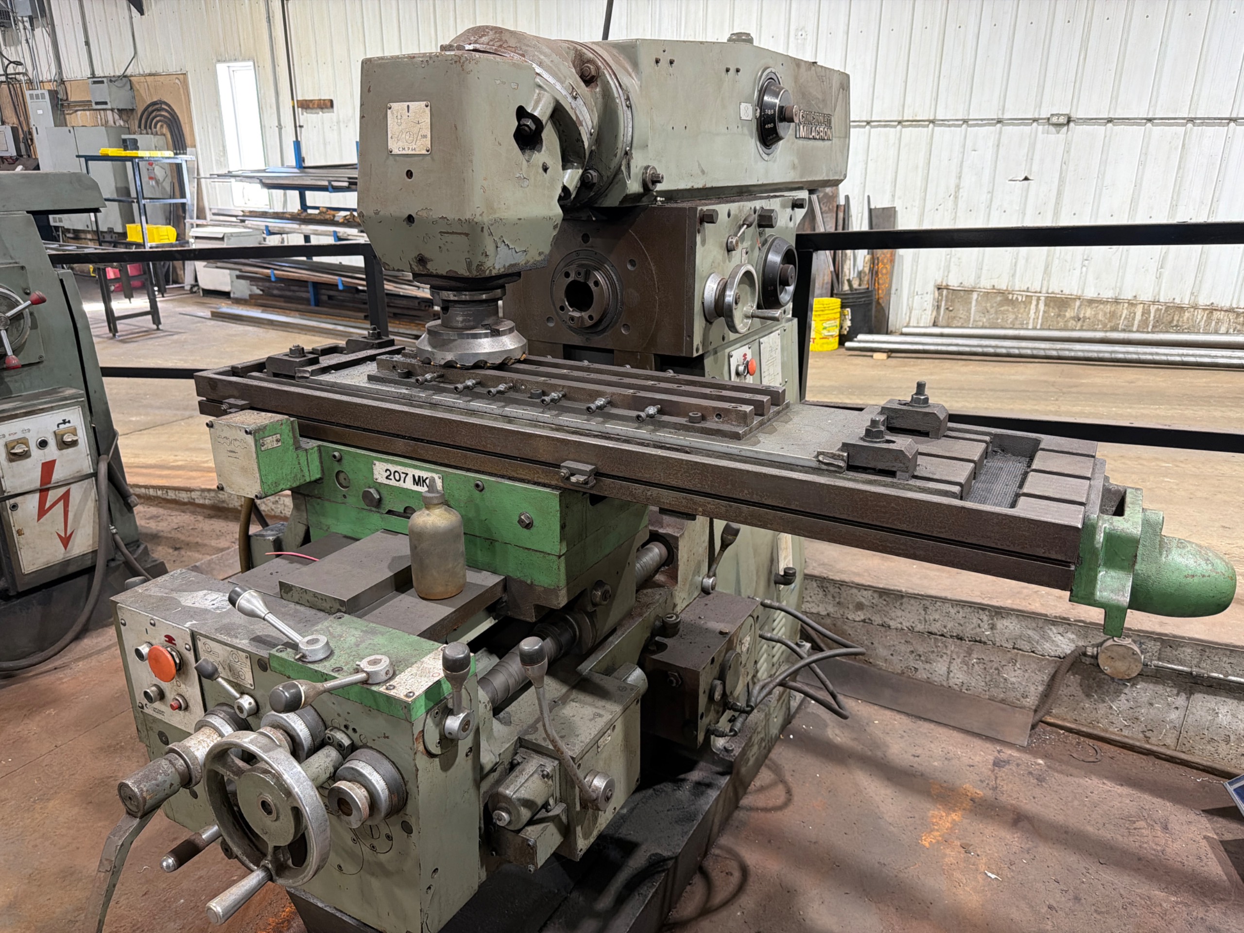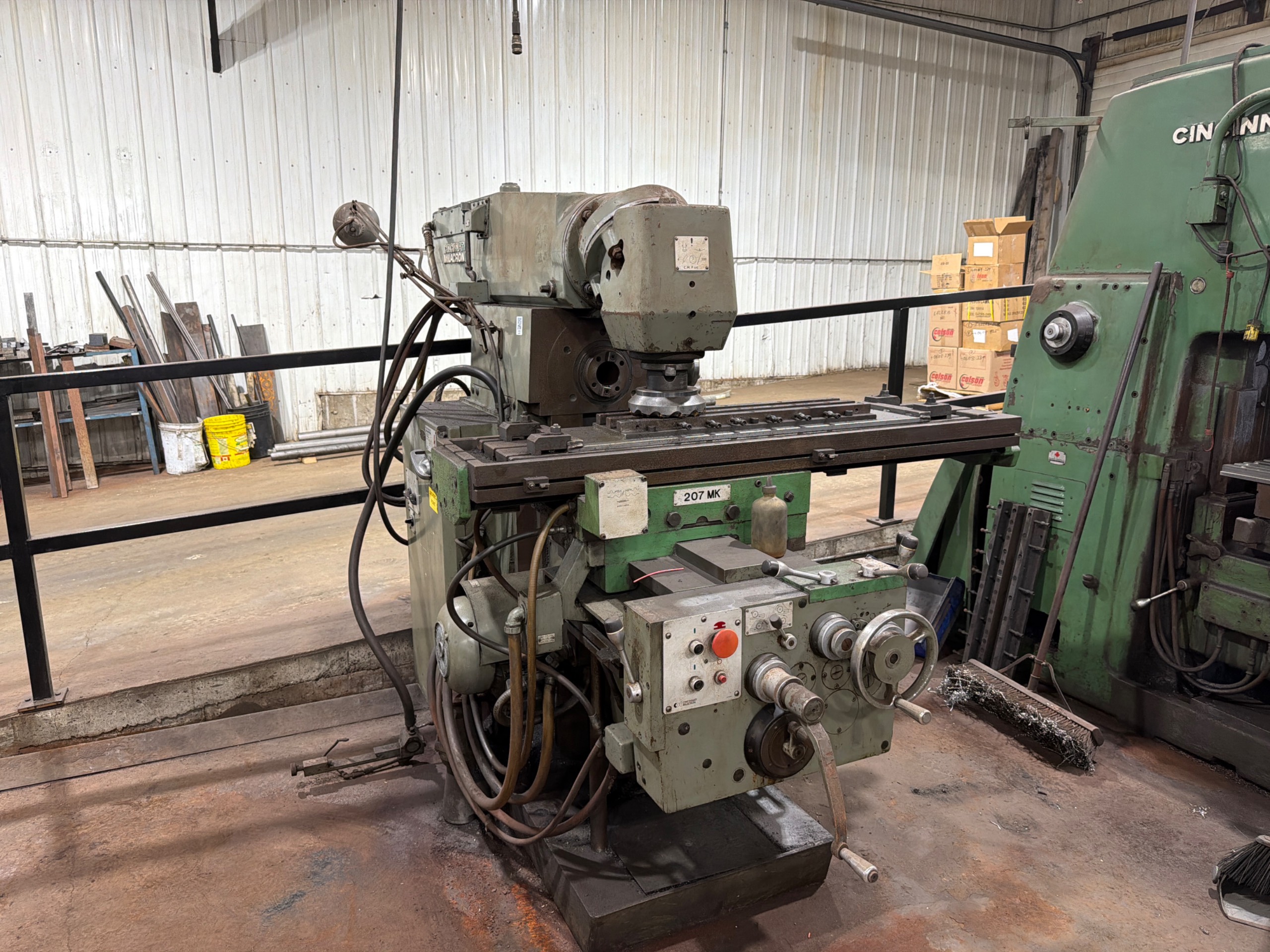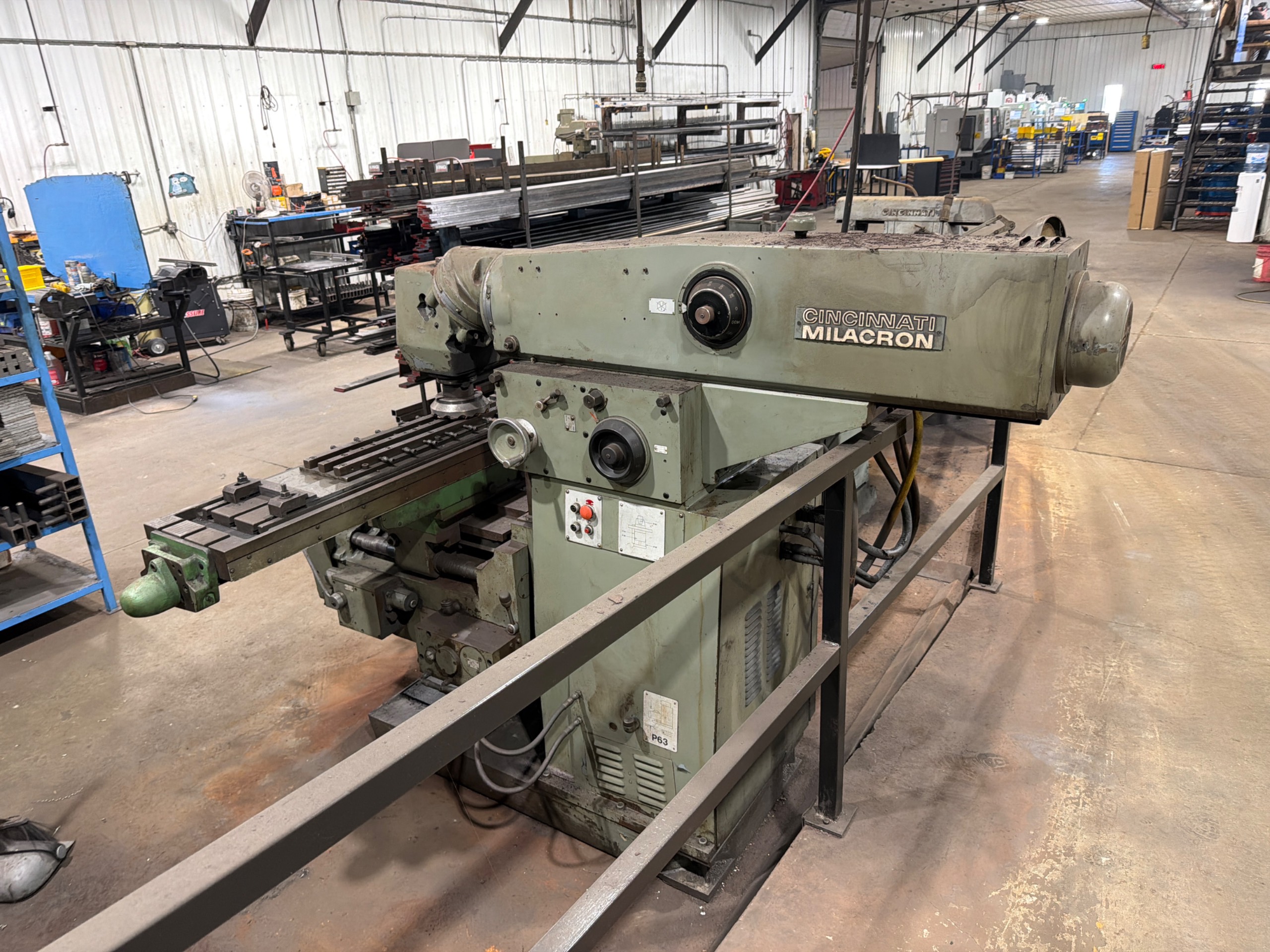 THE CINCINNATI MILACRON HORIZONTAL MILLING MACHINE IS A MANUAL KNEE-TYPE MILL DESIGNED FOR HEAVY-DUTY METAL MACHINING APPLICATIONS. THE MACHINE FEATURES A HORIZONTAL SPINDLE CONFIGURATION WITH OVERARM SUPPORT FOR ARBOR-BASED CUTTING OPERATIONS. IT IS EQUIPPED WITH A UNIVERSAL SWIVEL TABLE PROVIDING MULTI-AXIS MACHINING CAPABILITY. THE SPINDLE UTILIZES A #50 TAPER AND IS DRIVEN BY AN ELECTRIC MOTOR. THE MACHINE INCLUDES MANUAL CONTROLS FOR LONGITUDINAL, CROSS, AND VERTICAL AXIS MOVEMENTS, ALONG WITH POWER FEED AND RAPID TRAVERSE FUNCTIONS. CONSTRUCTION INCLUDES A RIGID CAST FRAME WITH BOX WAYS DESIGNED FOR STABILITY AND PRECISION DURING MACHINING OPERATIONS.