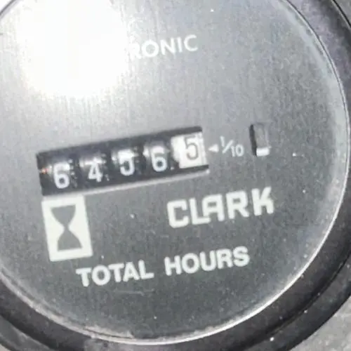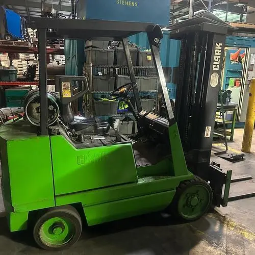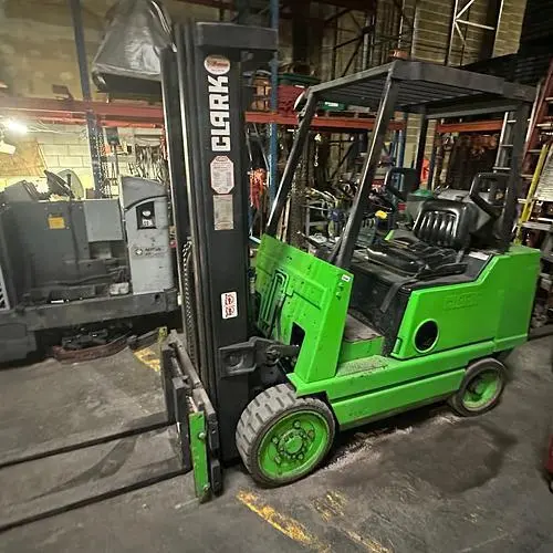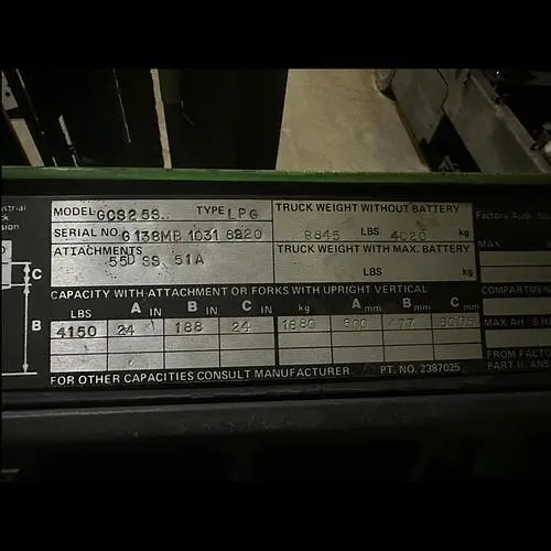 THIS CLARK FORKLIFT, MODEL GVS25S, IS DESIGNED WITH A 4000 LBS LOAD CAPACITY. IT OPERATES ON PROPANE FUEL. THE MACHINE HAS A REGISTERED TRUCK WEIGHT OF 8845.