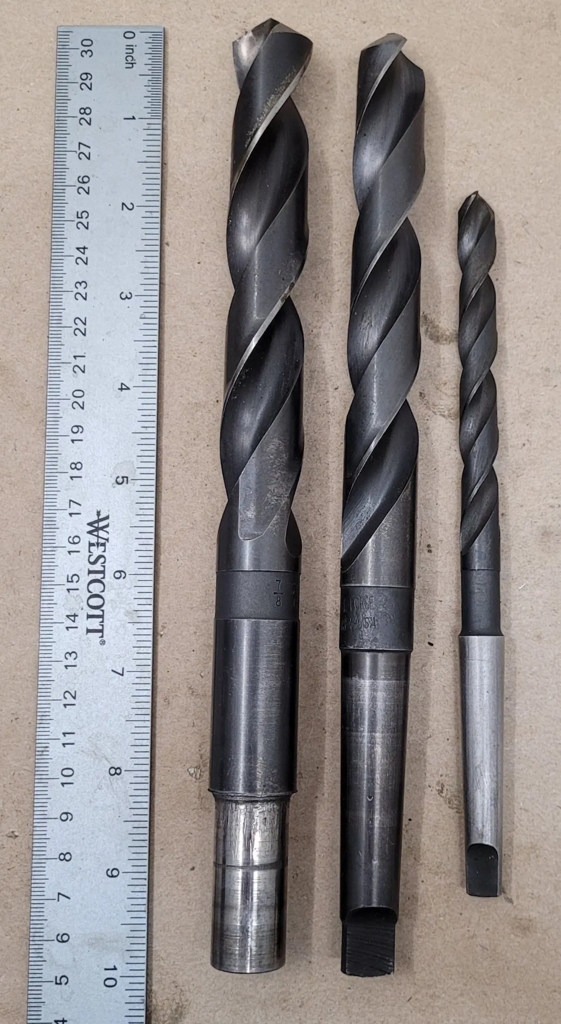 THIS SET OF CLE-FORGE HIGH-SPEED STEEL (HSS) TWIST DRILLS CONSISTS OF THREE UNITS IN VARIOUS SIZES. THE FIRST DRILL FEATURES A 25/32" DIAMETER WITH A 9-3/4" OVERALL LENGTH (OAL) AND A 2MT SHANK. THE SECOND DRILL HAS A 27/64" DIAMETER, A 7-1/4" OVERALL LENGTH, AND A 1MT SHANK. THE THIRD DRILL IN THE SET IS 7/8" IN DIAMETER WITH A 9-3/4" OVERALL LENGTH AND A SHANK MODIFIED TO 0.73" FROM 0.875".