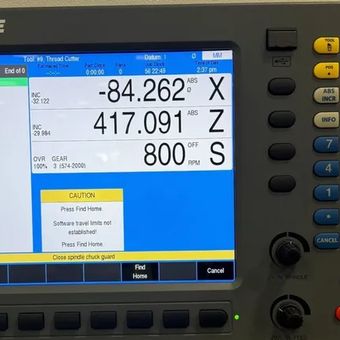 THIS CNC TURNING CENTER FEATURES A 14" SWING OVER THE BED AND 6.7" SWING OVER THE CROSS SLIDE, WITH A DISTANCE BETWEEN CENTERS OF 40" AND AN APPROXIMATE MACHINE WEIGHT OF 2,750 LBS. THE SPINDLE IS DRIVEN BY A 5 HP MOTOR, FEATURES A D1-4 NOSE AND A 1.5" BORE, AND UTILIZES A #5MT TAPER. SPINDLE SPEEDS ARE INFINITELY VARIABLE ACROSS THREE RANGES: LOW (30-140 RPM), MEDIUM (110-540 RPM), AND HIGH (410-2000 RPM). RAPID TRAVERSE RATES FOR BOTH THE X AND Z AXES ARE 100 IPM, POWERED BY A 1.6 HP X, Z SERVO MOTOR. THE TAILSTOCK HAS A 1.75" QUILL DIAMETER, A 3MT TAPER, AND A 4.75" QUILL STROKE. IT IS EQUIPPED WITH THE ACU-RITE TURN POWER CONTOURING CONTROL, WHICH FEATURES A 12.1" COLOR LED DISPLAY AND ENABLES CONVERSATIONAL PROGRAMMING. THE CONTROL SUPPORTS PGM MODE OPERATIONS INCLUDING THREAD, RECESS, AND TURNING CYCLES, ALONG WITH POSITION/DRILL, LINE, ARC, AND BLEND FUNCTIONS. IT ALSO SUPPORTS DXF FILE IMPORT AND G-CODE PROGRAMS. INCLUDED ACCESSORIES ARE A COOLANT SYSTEM, A 3-JAW CHUCK, AND AN ALORIS QUICK CHANGE TOOLPOST WITH HOLDERS.