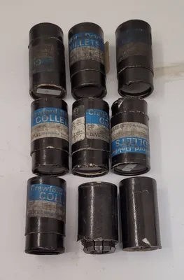 THE ITEM CONSISTS OF A LOT OF NINE CRAWFORD DEVLIEG 10SG COLLETS. THESE TOOLING ACCESSORIES FEATURE A 3/4IN DIAMETER HOLE, DESIGNED FOR PRECISION APPLICATIONS. THE COLLETS ARE IDENTIFIED AS THE 10SG MODEL MANUFACTURED BY CRAWFORD DEVLIEG.