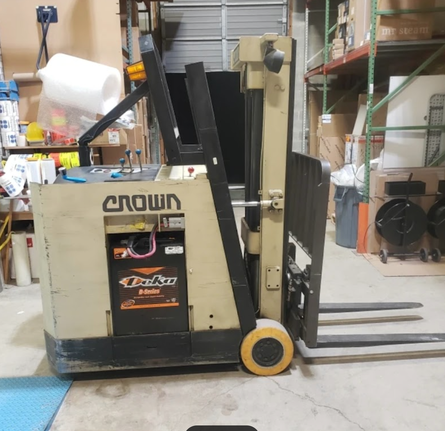 THE CROWN 35RCTT IS A STAND-UP COUNTERBALANCE ELECTRIC FORKLIFT BUILT FOR MATERIAL HANDLING. IT IS POWERED BY A 36-VOLT ELECTRICAL SYSTEM AND FEATURES A BASE LIFT CAPACITY OF 3500 LB. THE MACHINE IS EQUIPPED WITH A TRIPLE STAGE MAST, ALLOWING FOR A MAXIMUM LIFT HEIGHT OF 190 INCHES. IT IS CAPABLE OF ACHIEVING A TRAVEL SPEED OF UP TO 7.2 MPH. THE APPROXIMATE WEIGHT FOR THIS FORKLIFT MODEL IS 8170 POUNDS. THIS TRUCK IS DESIGNED TO PROVIDE STABILITY AND HIGH MANEUVERABILITY FOR STACKING AND TRANSPORTING LOADS IN WAREHOUSE AND NARROW AISLE APPLICATIONS.