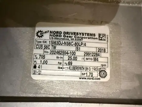 • MOTOR: NORD TYPE SK 1SI63DJ-N56C-80LP/4, 1 HP, 25 RPM, 705 LB-IN TORQUE, YEAR 2018